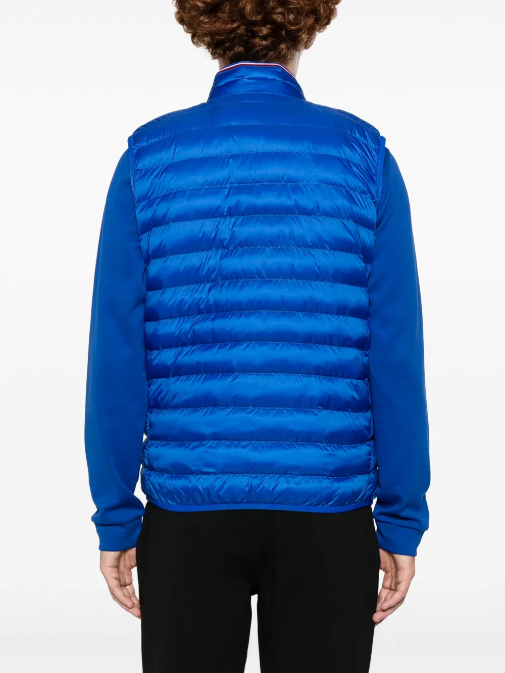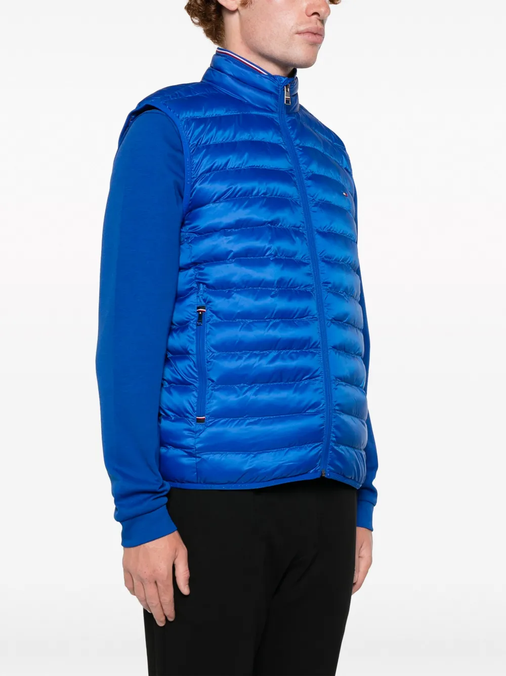 Голубой, переработанный полиэстер, легкий материал, дутый материал, вышитый логотип на груди, высокий воротник, застежка на молнии спереди, без рукавов, два кармана на молнии по бокам и закругленный подол.