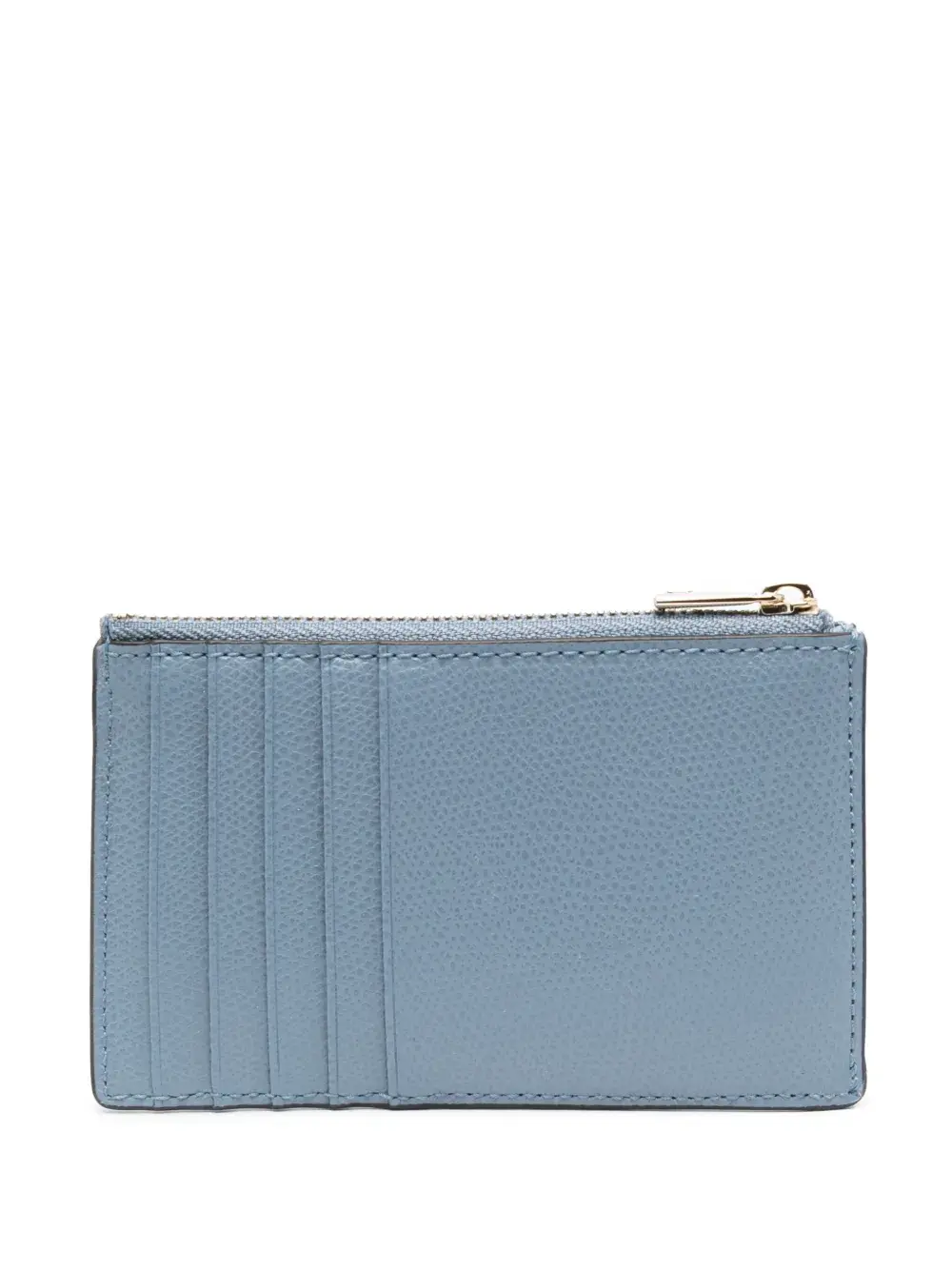 Голубой, телячья кожа, зернистая текстура, золотистый металлический логотип, бледно-золотистая фурнитура, отделения для карт, застежка на молнии сверху и основное отделение.