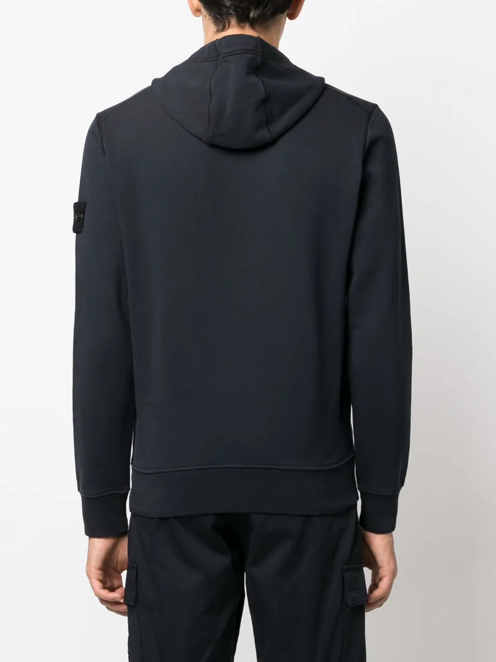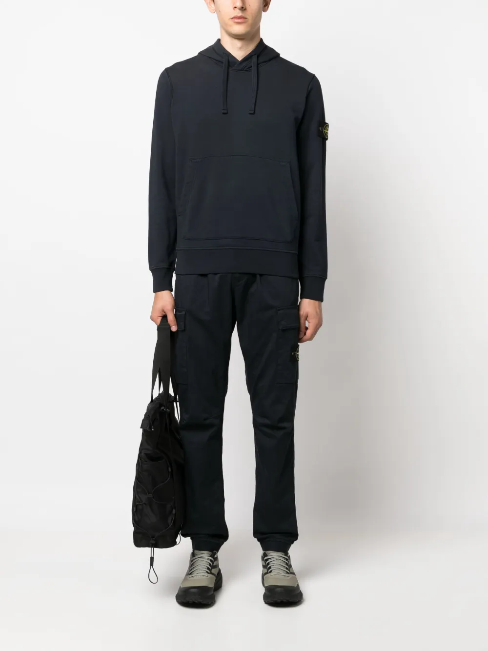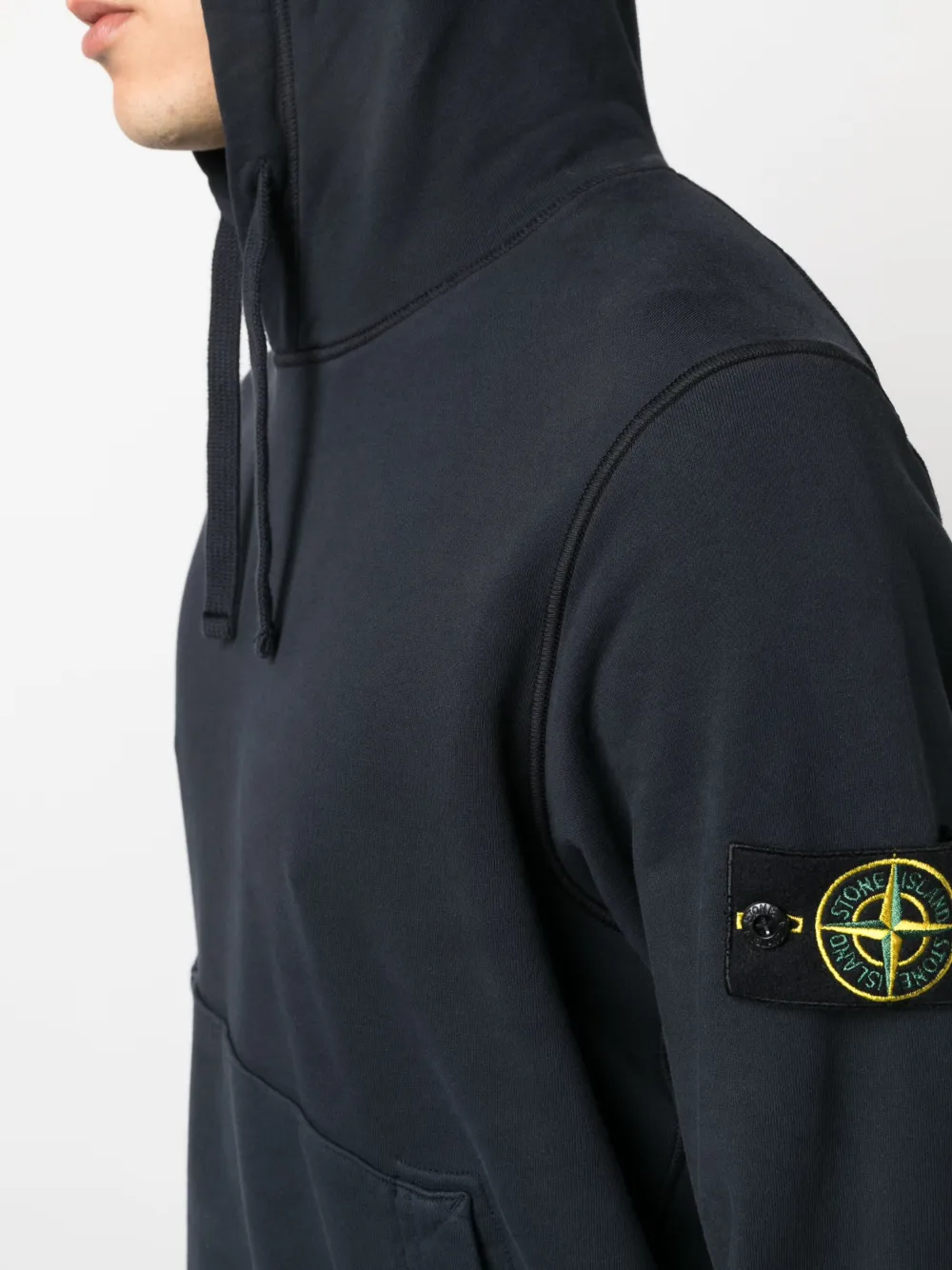 Темно-синий, хлопок, знаковая деталь в виде компаса, нашивка с логотипом на рукаве, затягивающийся на шнурок капюшон, длинные рукава, карман-муфта и прямой подол.