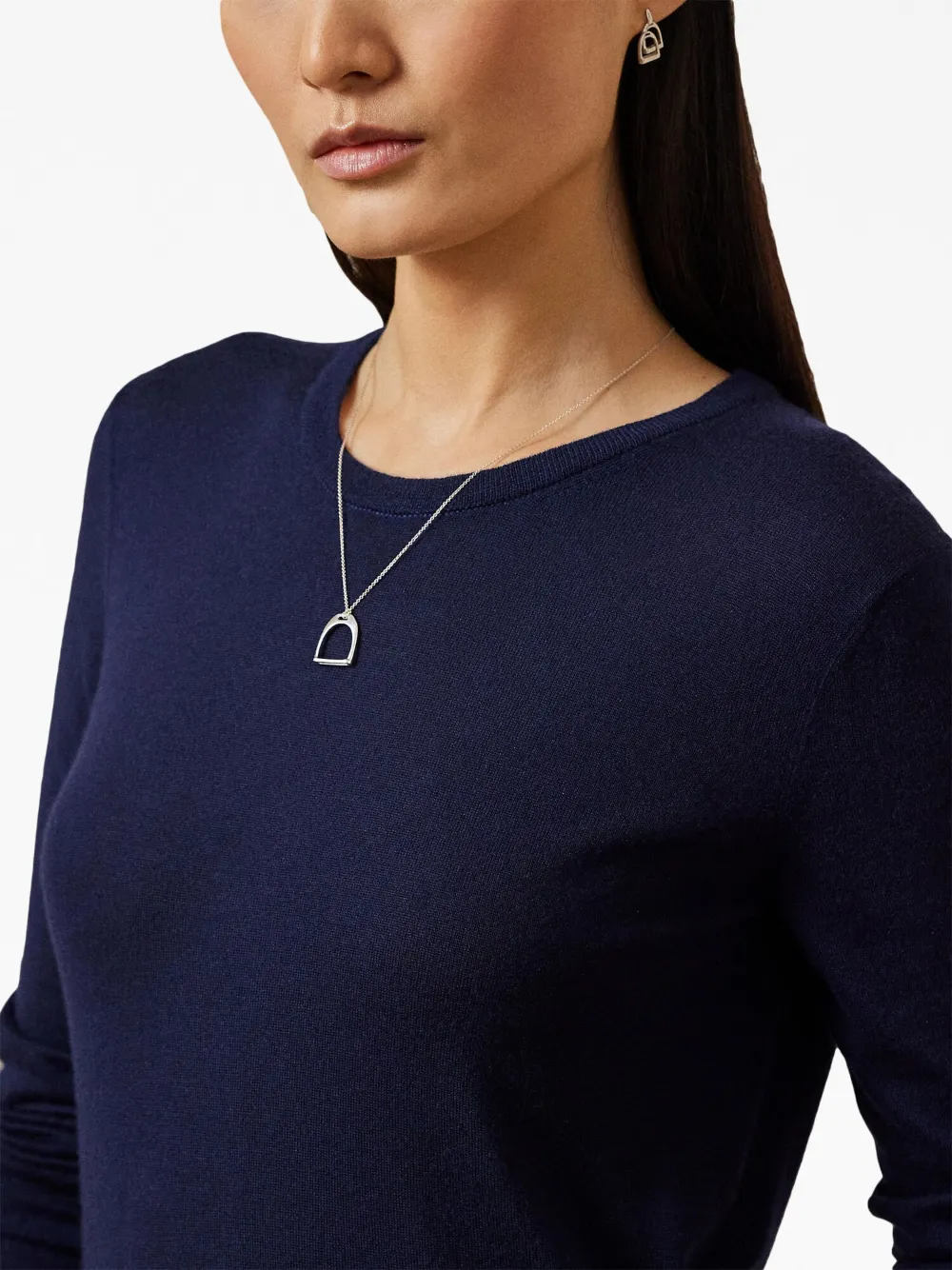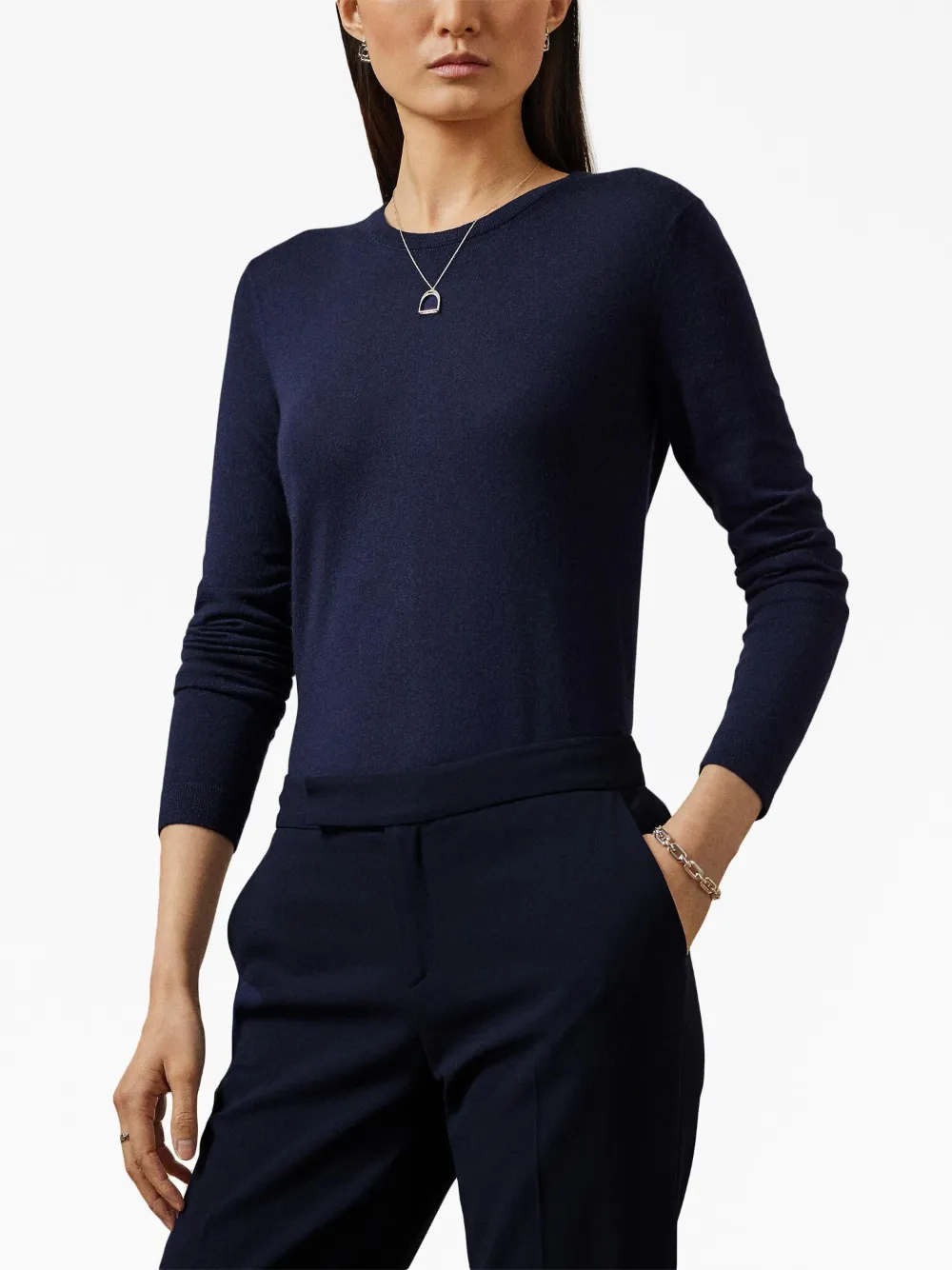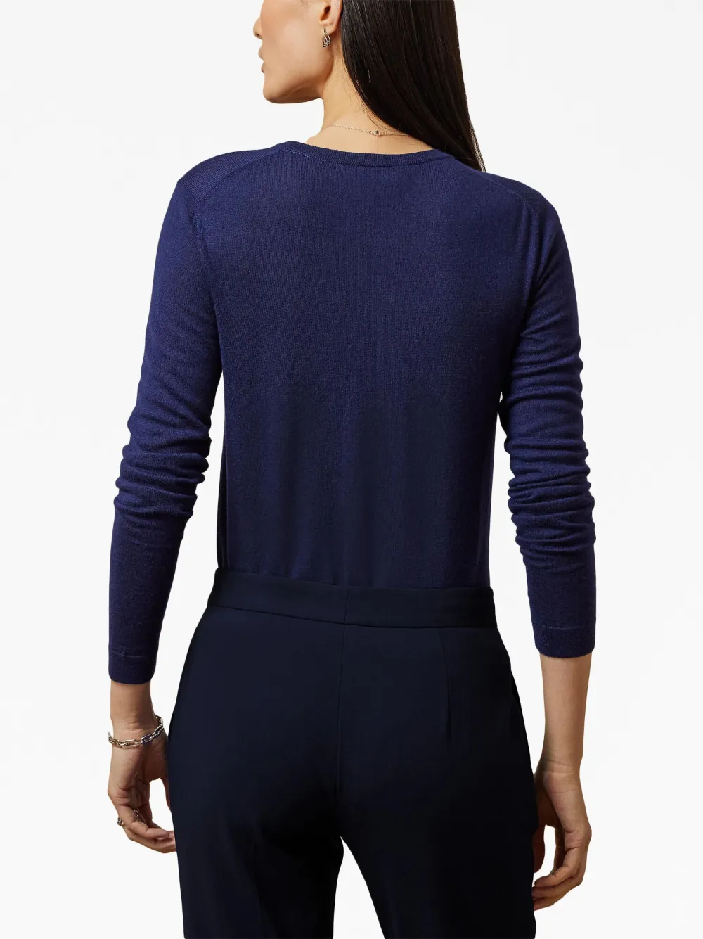 Темно-синий, кашемир, тонкая вязка, круглый вырез, длинные рукава и прямой подол.