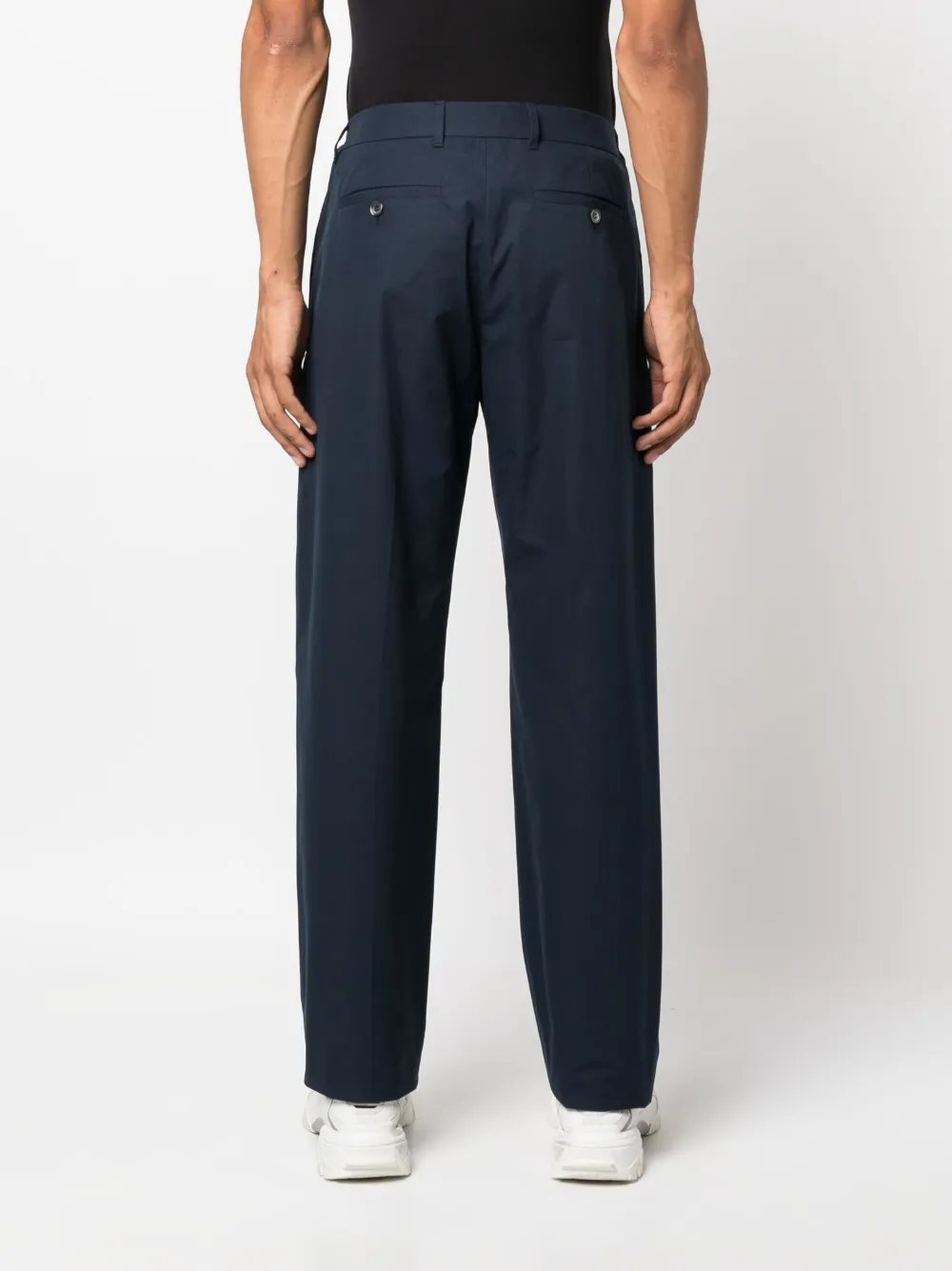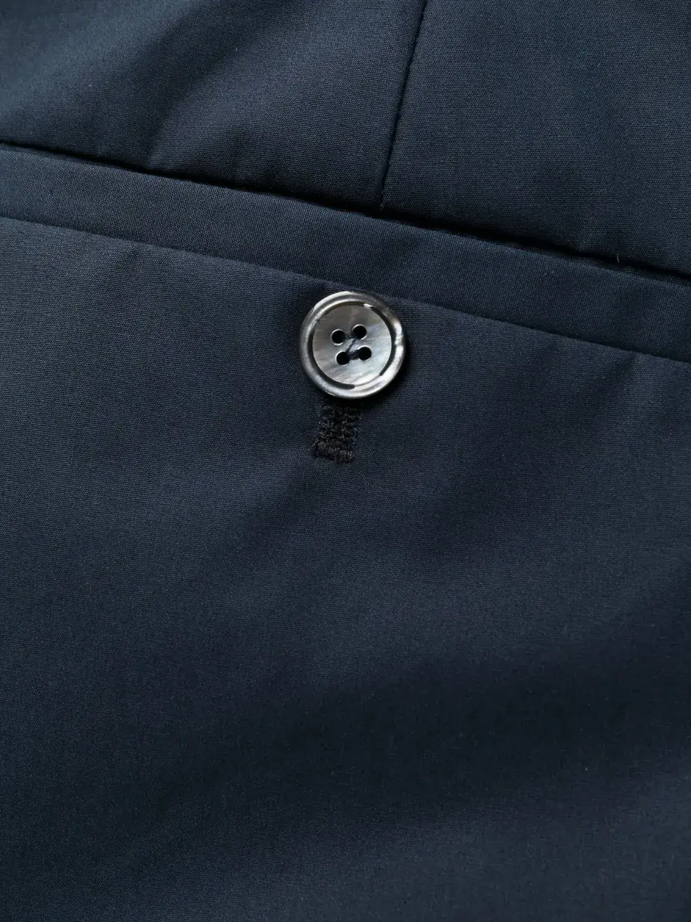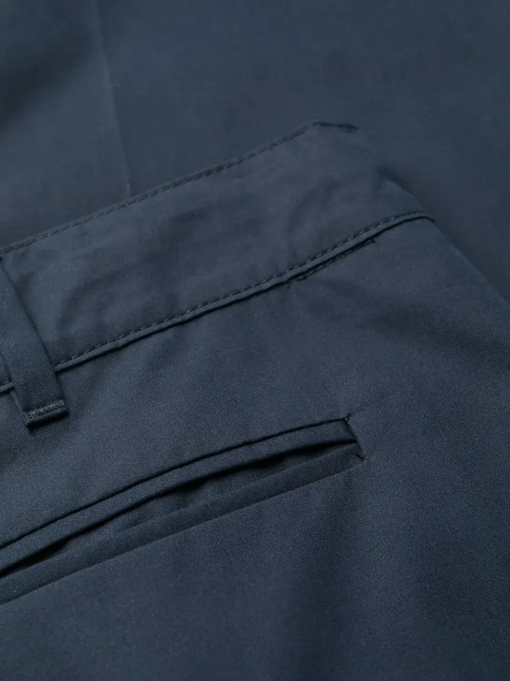 Темно-синий, хлопок, средняя посадка, петли для ремня, потайная застежка на молнии и пуговицах, кулиска на талии, прорезной карман спереди, два кармана с листочкой сзади и прямой крой.