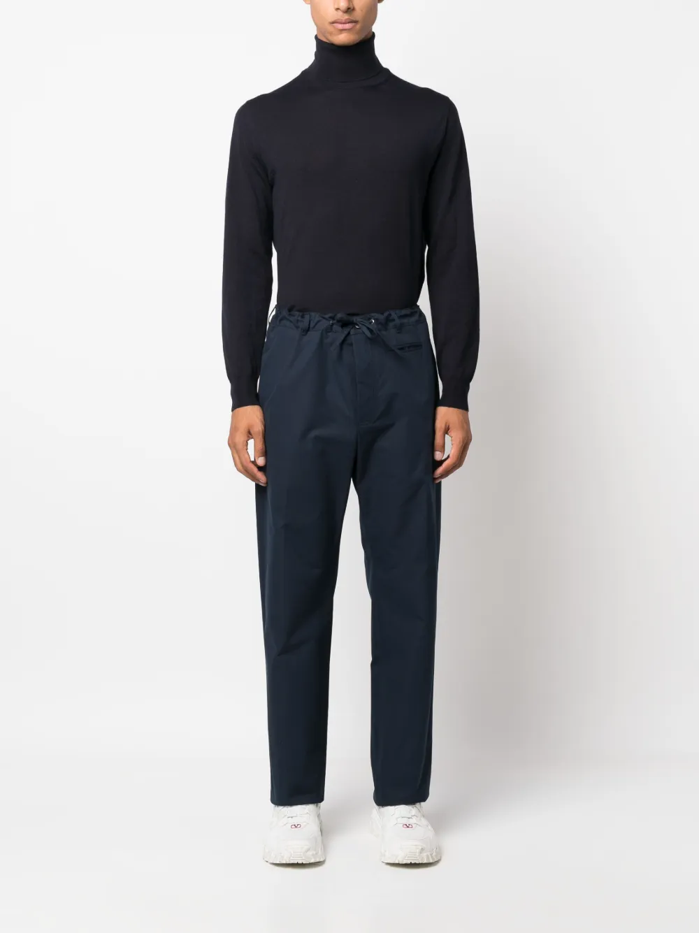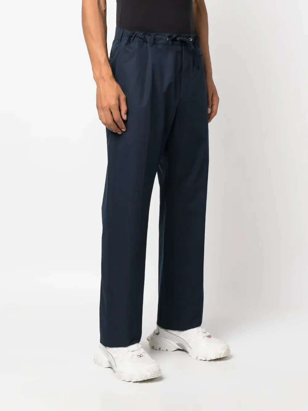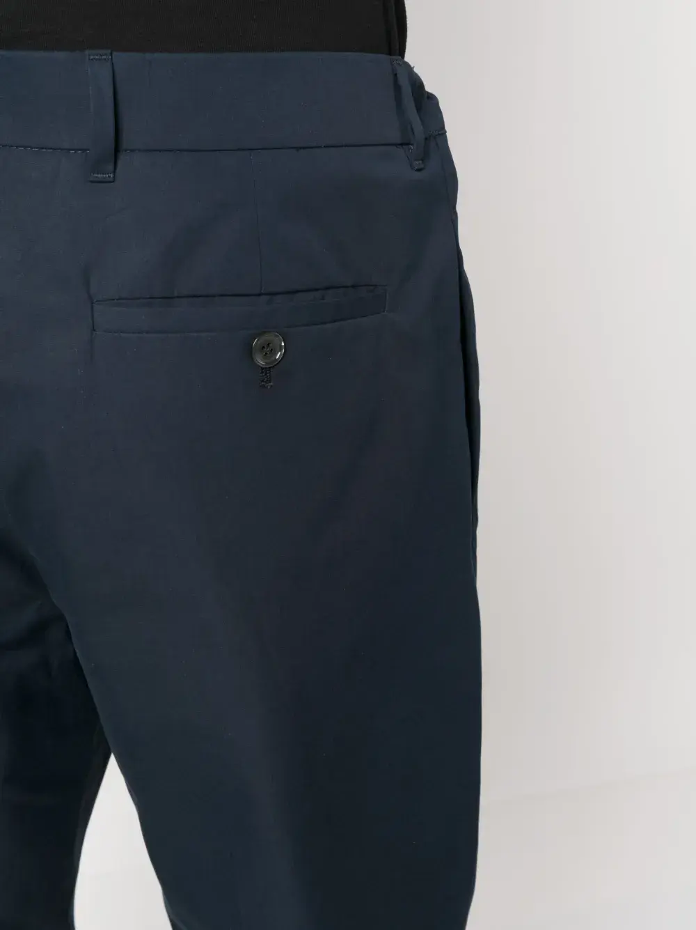 Темно-синий, хлопок, средняя посадка, петли для ремня, потайная застежка на молнии и пуговицах, кулиска на талии, прорезной карман спереди, два кармана с листочкой сзади и прямой крой.