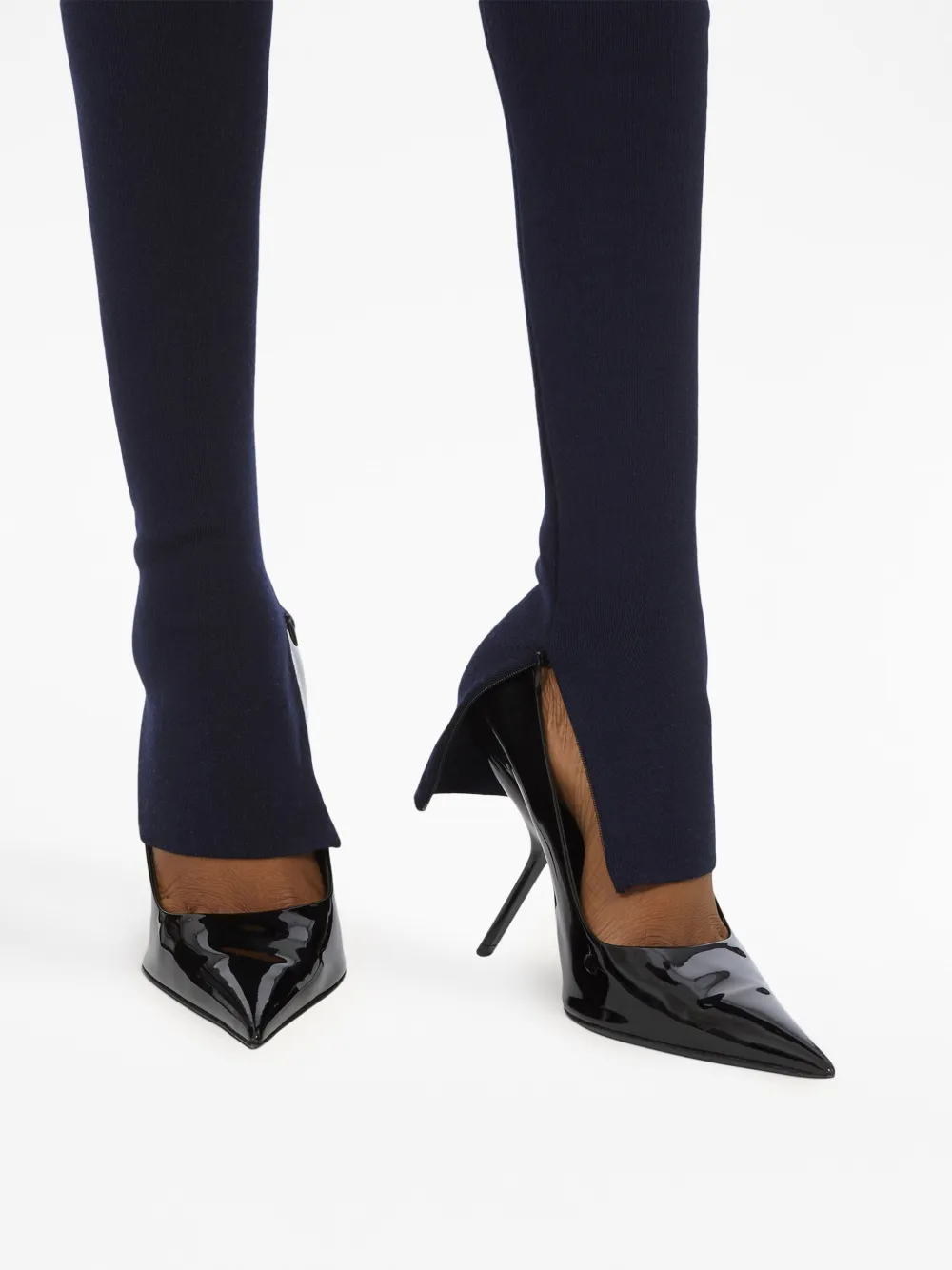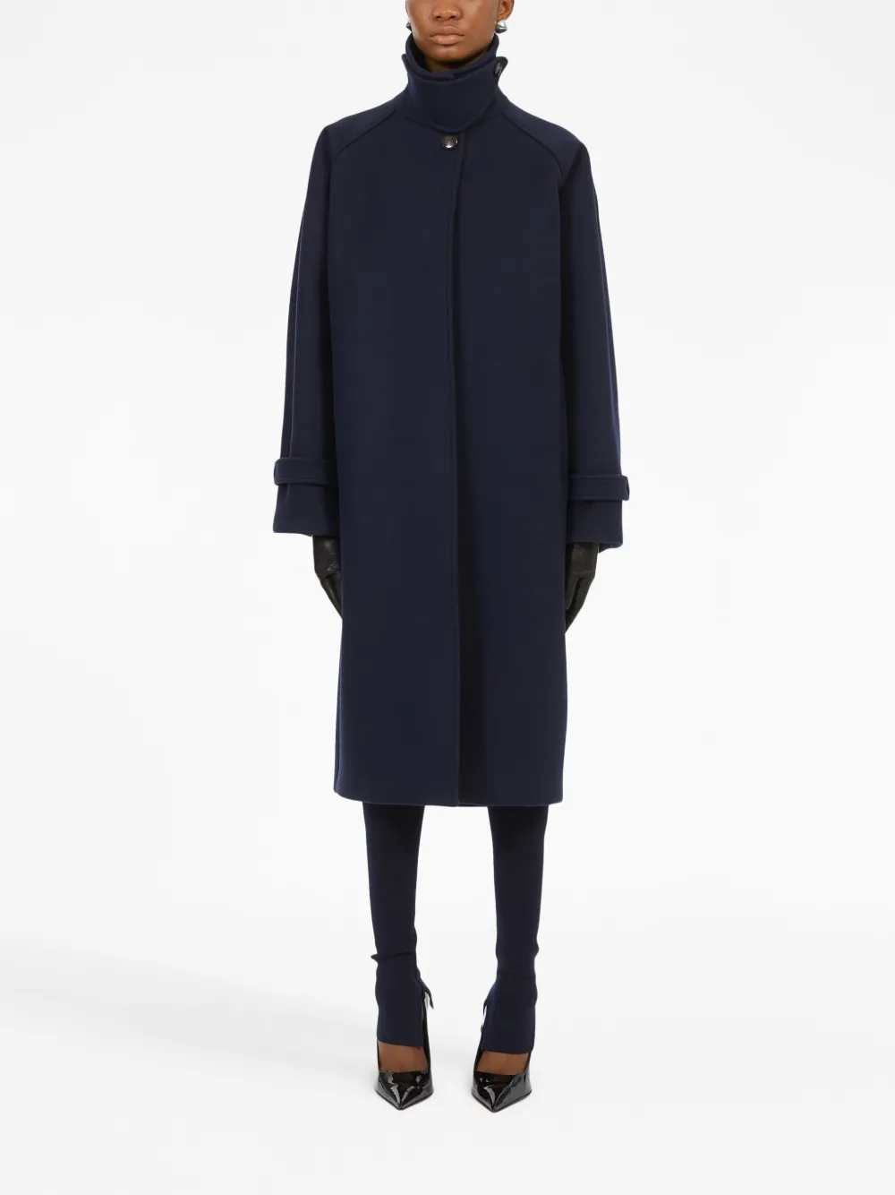 Темно-синий, необработанная шерсть, трикотажный материал, металлический логотип, эластичный пояс и длинная модель.