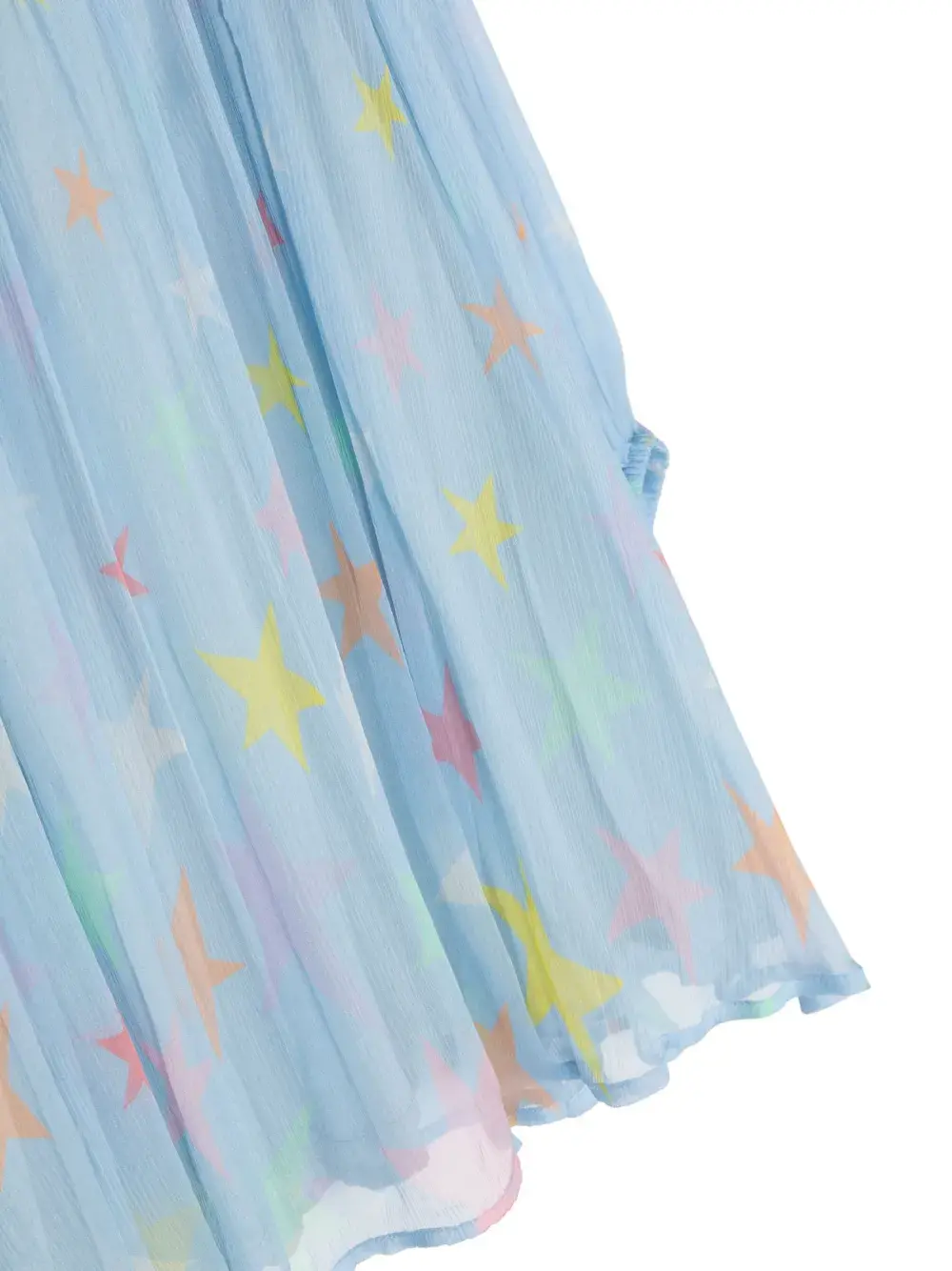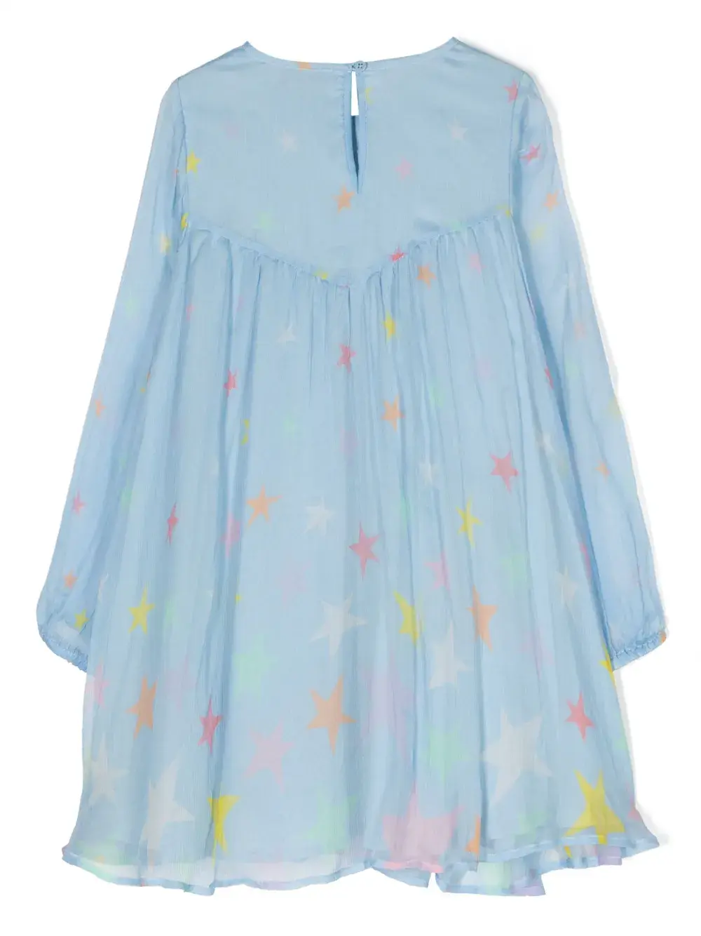 Голубой, шелк, шифон, принт с изображением звезд, складки, круглый вырез, длинные рукава, эластичные манжеты, застежка на пуговицу сзади и расклешенный подол. Узнать больше о том, какие товары получают отметку «Ответственный выбор», можно из материала «Как мы оцениваем экологичность и этичность».