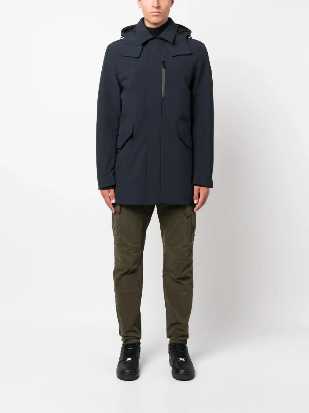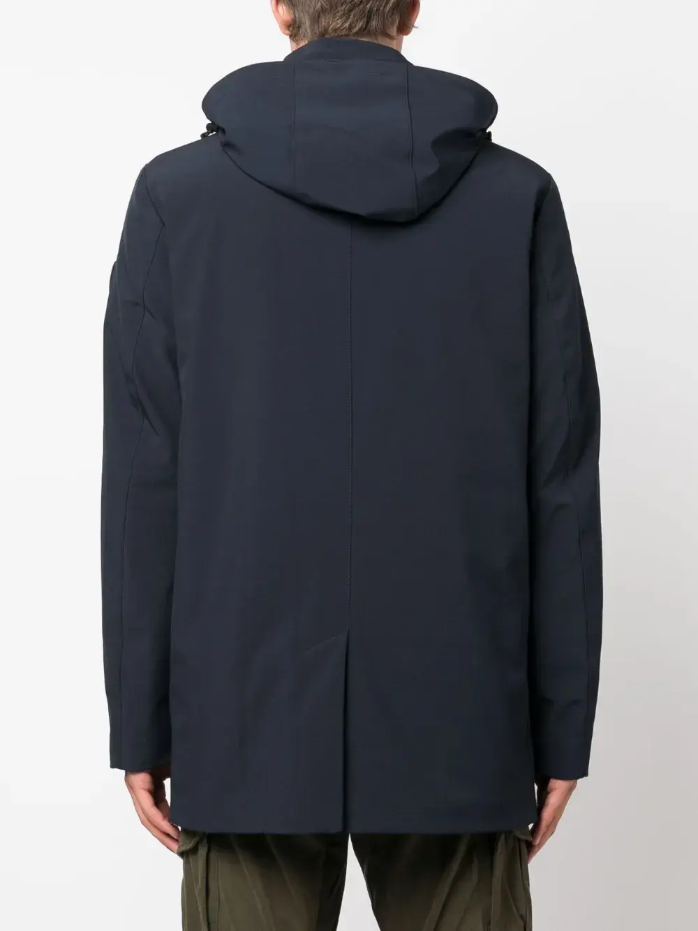 Темно-синий, наполнитель из пуха и перьев, отложной воротник, затягивающийся на шнурок капюшон, застежка на молнии спереди, два вшитых кармана по бокам, вырез сзади, длинные рукава и прямой подол.