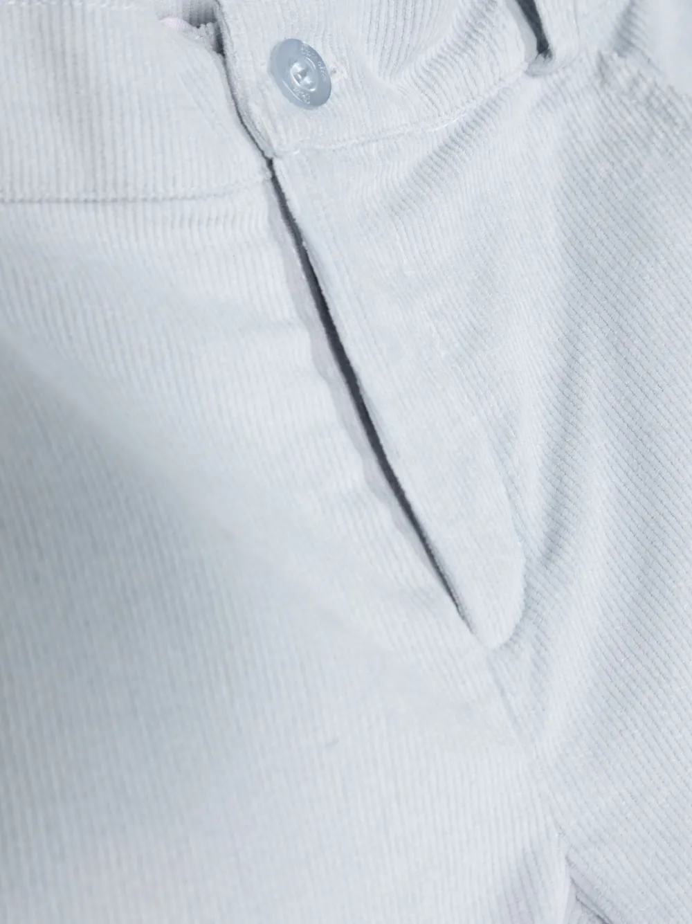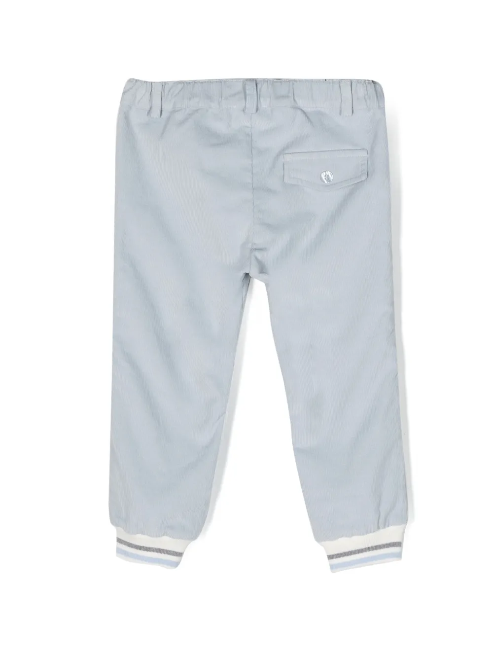Голубой, хлопок, эластичный пояс сзади, петли для ремня, полоски, эластичные манжеты, ширинка на пуговицах, два кармана по бокам и карман с клапаном сзади.