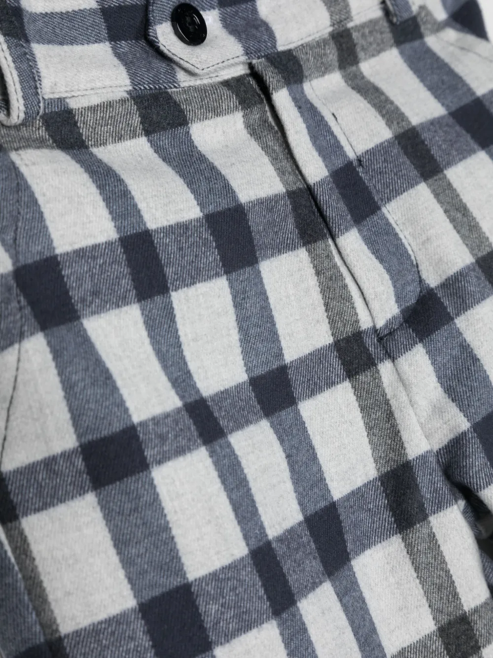 Светло-серый, темно-синий, черный, эластичный материал, клетчатый узор, петли для ремня, смещенная застежка спереди, два кармана по бокам и прорезной карман на пуговице сзади.
