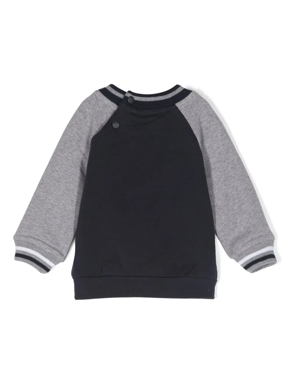 Темно-синий, серый, эластичный хлопок, логотип спереди, полоски, круглый вырез, застежка на кнопки сзади, длинные рукава, манжеты в рубчик и прямой подол.