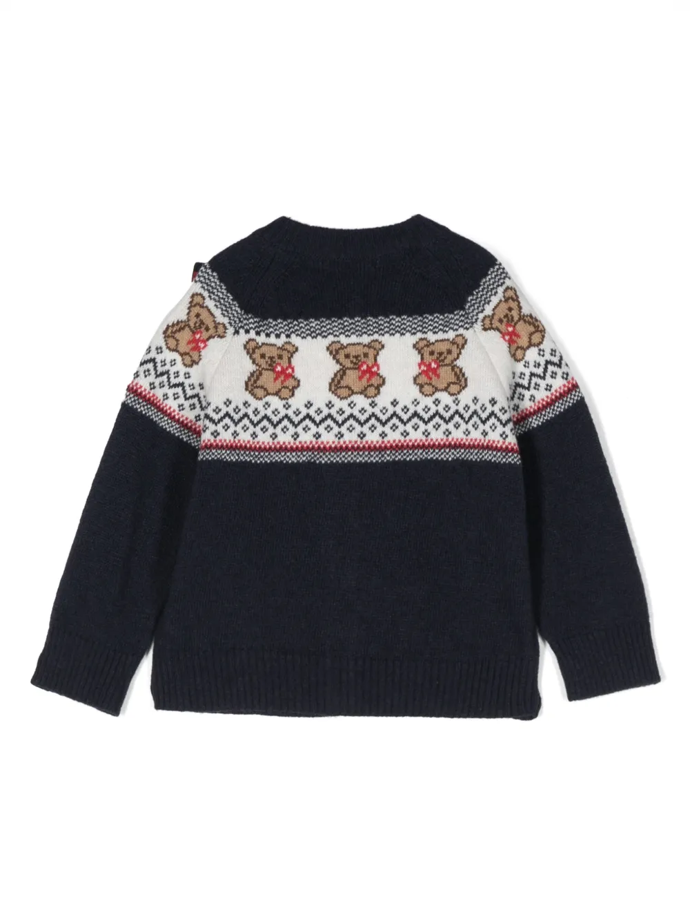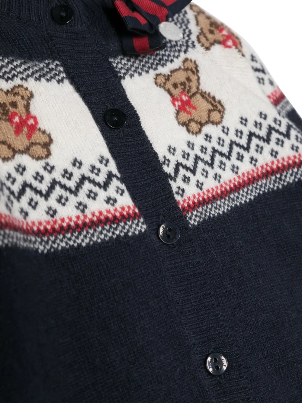 Темно-синий, разноцветный, вязка в технике интарсия, изображение медведя, бант, вязаные края в рубчик, круглый вырез, застежка на пуговицах спереди, длинные рукава и прямой подол.