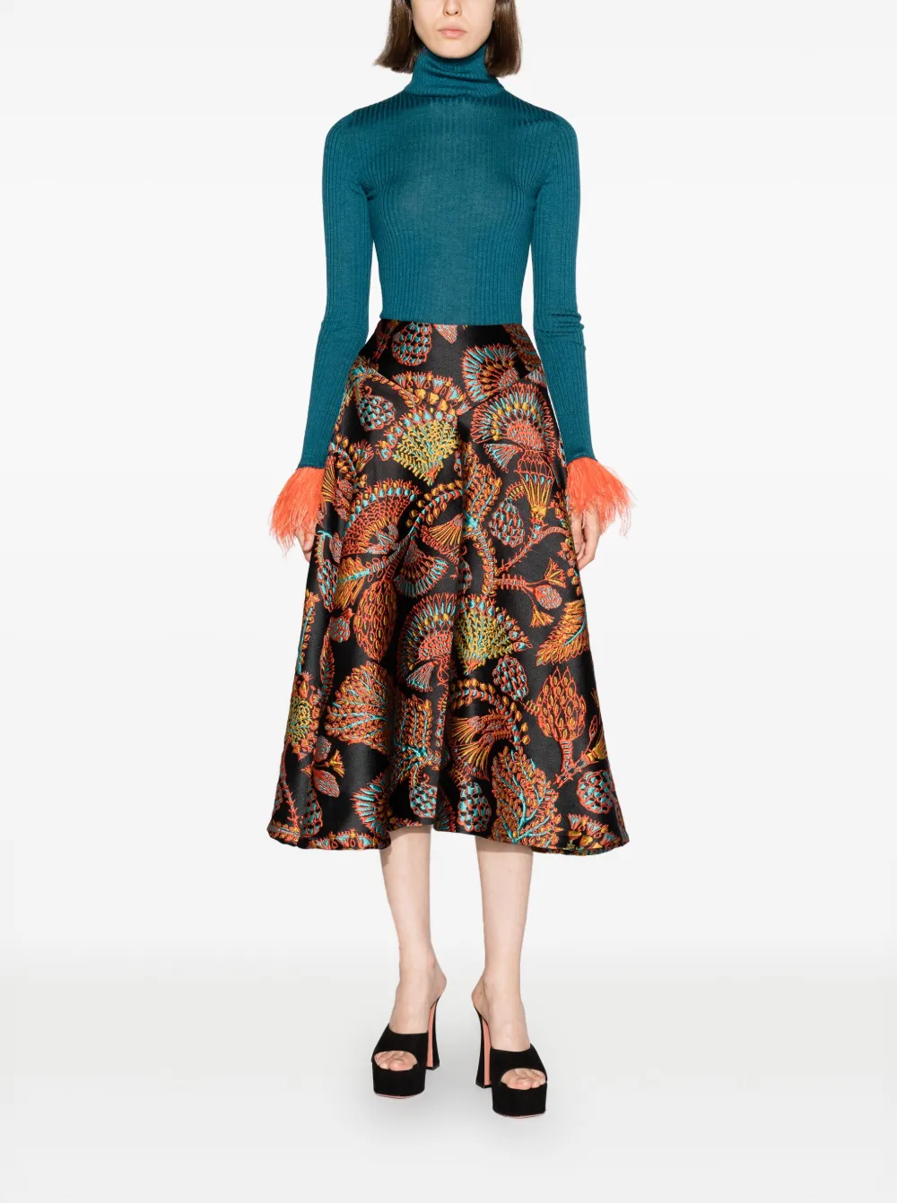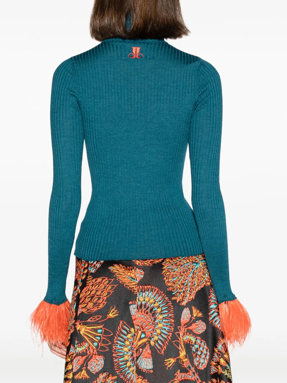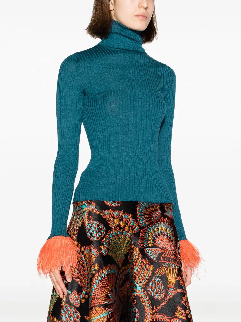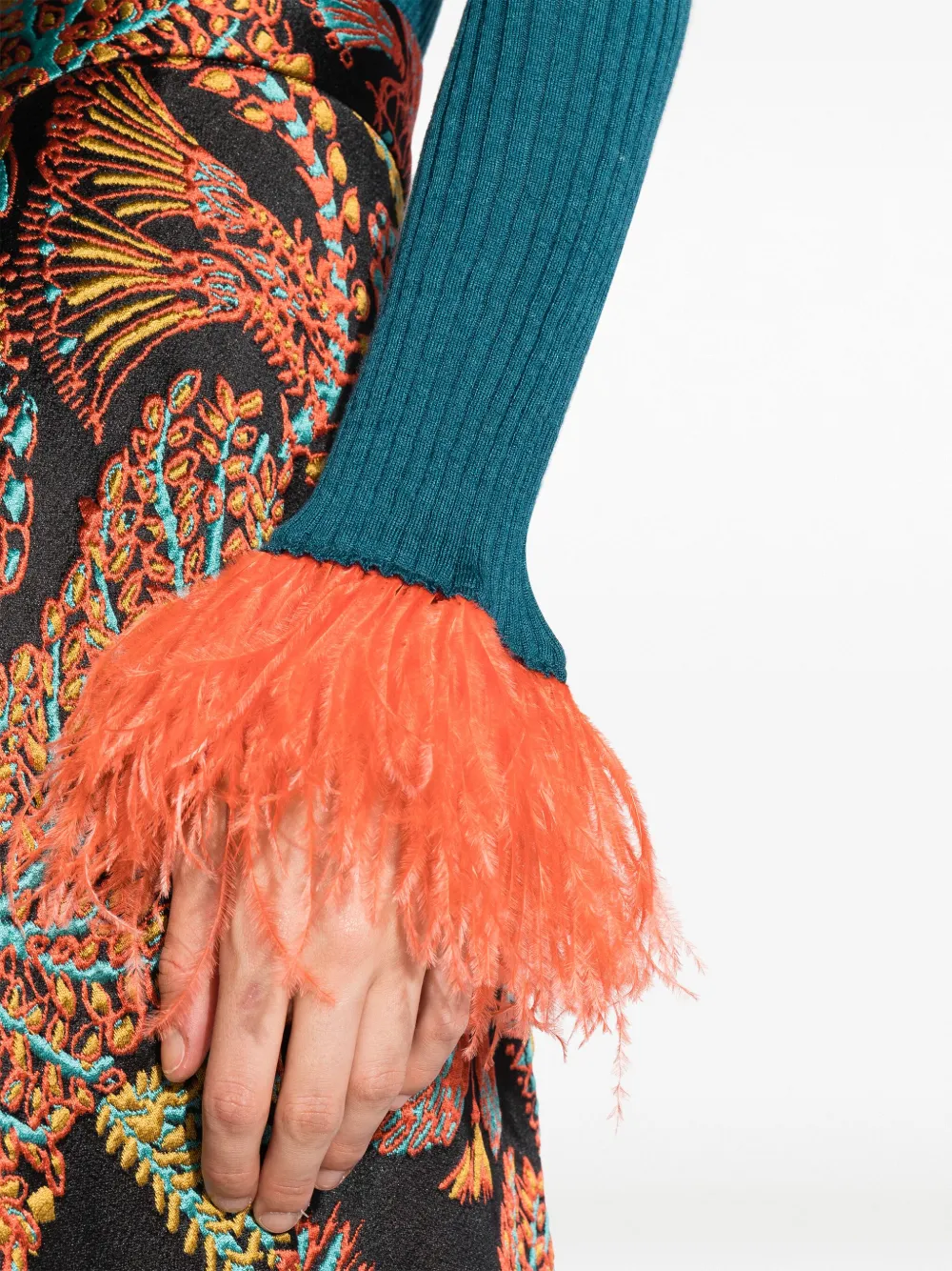 Синий, морковный, смесь кашемира и шелка, трикотаж в рубчик, высокий воротник, длинные рукава, отделка перьями и прямой подол.