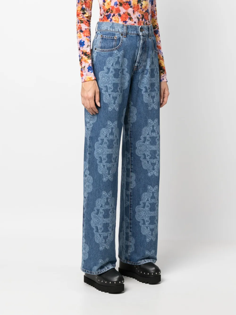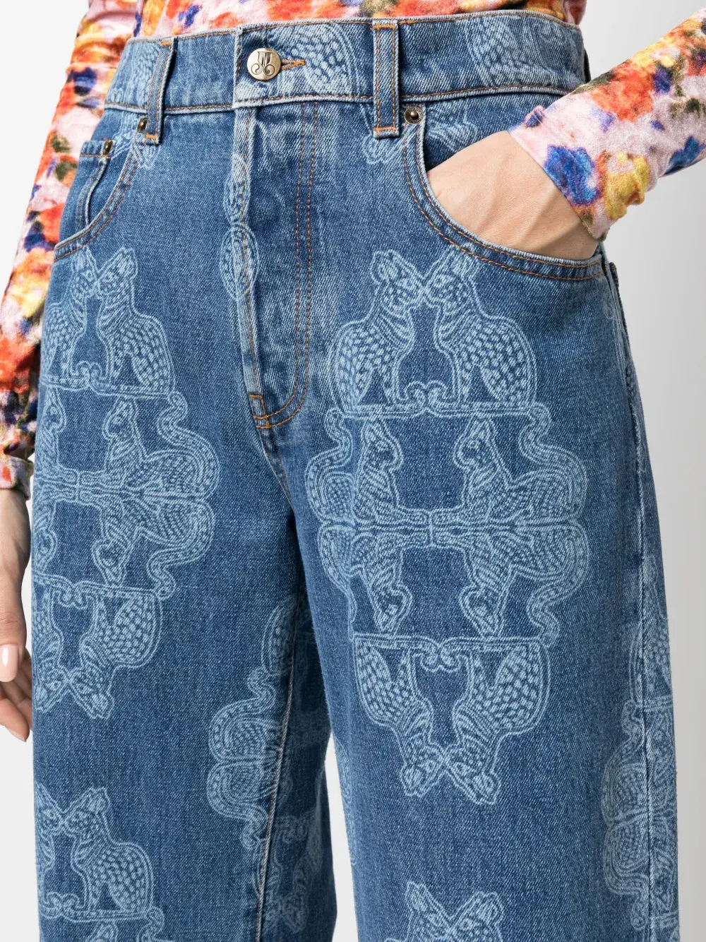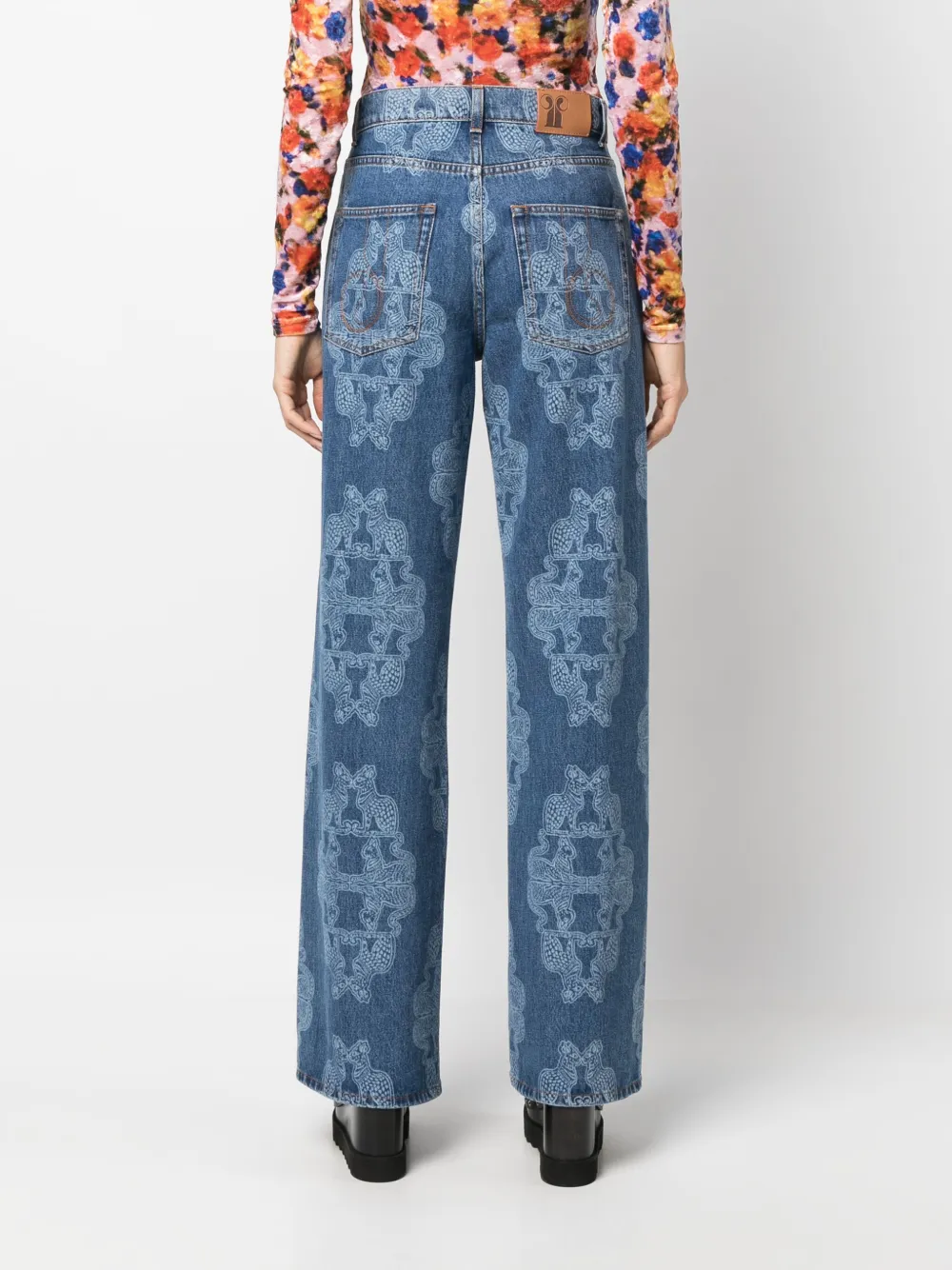 Синий, эластичный хлопок, деним, сплошной графичный принт, низкая посадка, петли для ремня, пять карманов, прямой крой, нашивка с логотипом сзади и прямой подол.