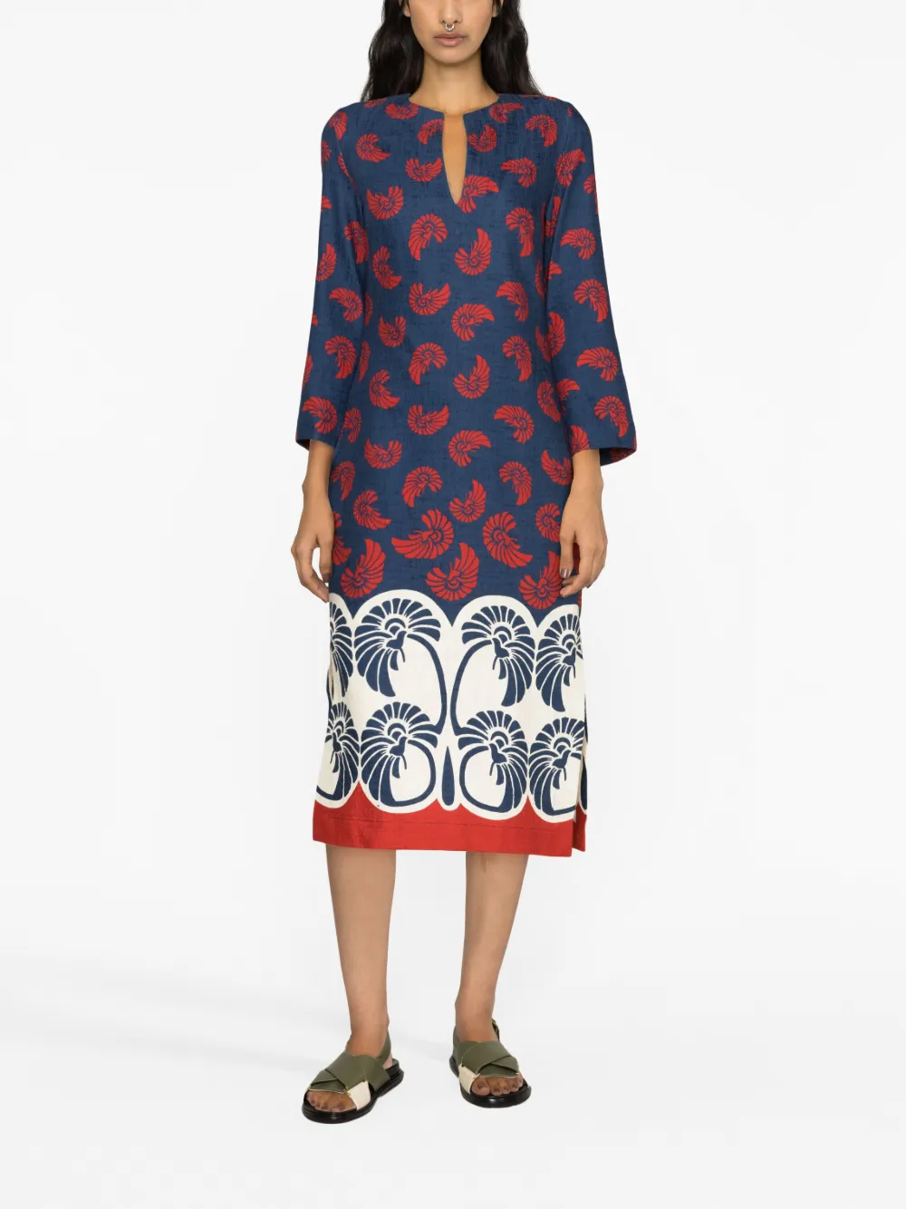 Красный/белый/синий, эластичный хлопок, узор с изображением монограммы, круглый вырез с разрезом, длинные рукава, модель без застежки, длина ниже колена и прямой подол.