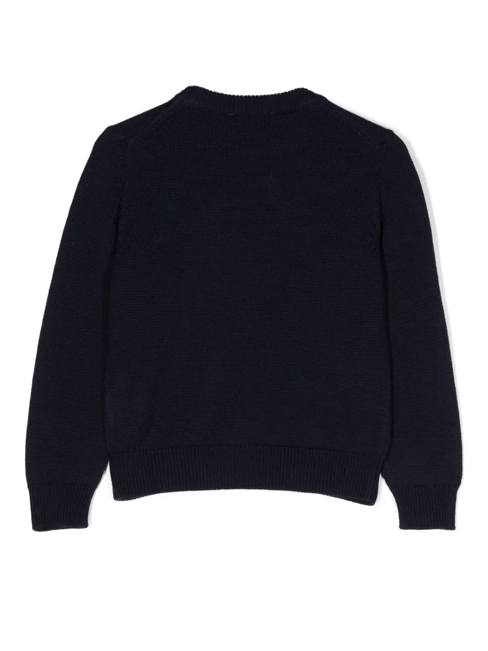 Темно-синий, необработанная шерсть, трикотажный материал, узор Medusa Head, круглый вырез и длинные рукава.