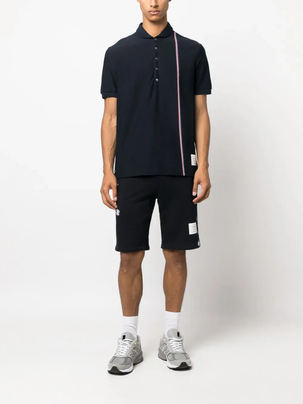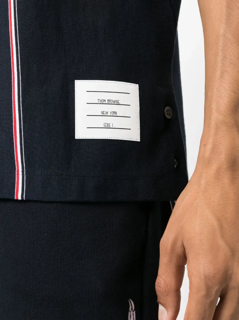 Темно-синий, красный, белый, хлопок, ткань джерси, отделка корсажной лентой, полоски RWB, знаковая деталь в полоску по бокам, клубный воротник, короткая застежка на пуговицах спереди, короткие рукава и прямой подол.