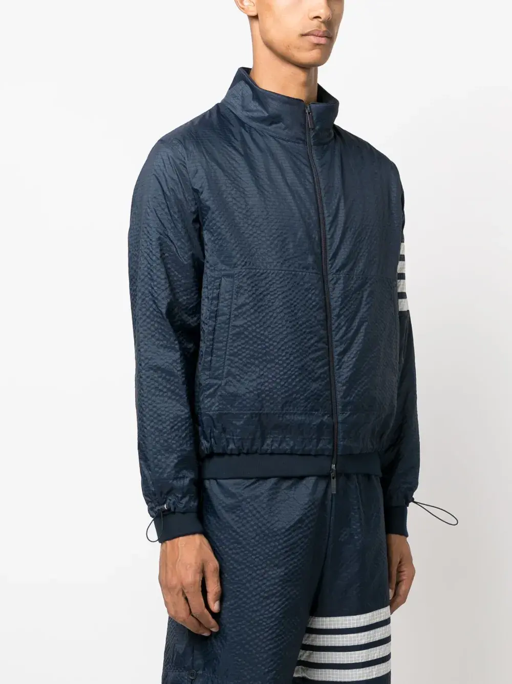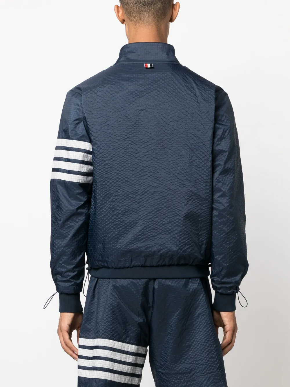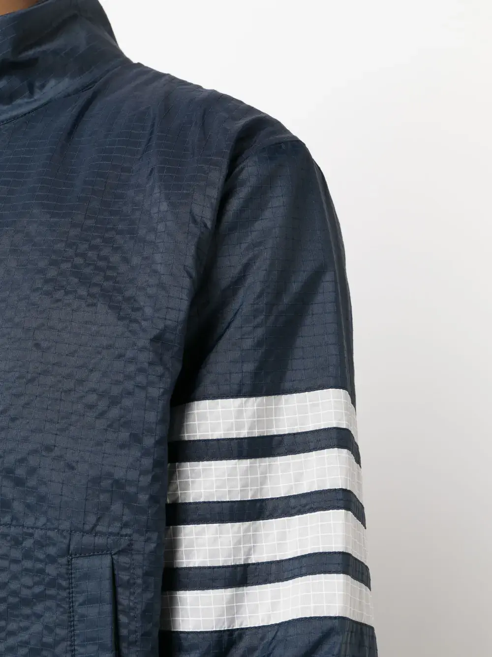 Темно-синий, белый, рипстоп, легкий материал, воротник-труба, застежка на молнии спереди, полоски 4-Bar, два прорезных кармана по бокам, длинные рукава, манжеты с кулиской и подол с кулиской.