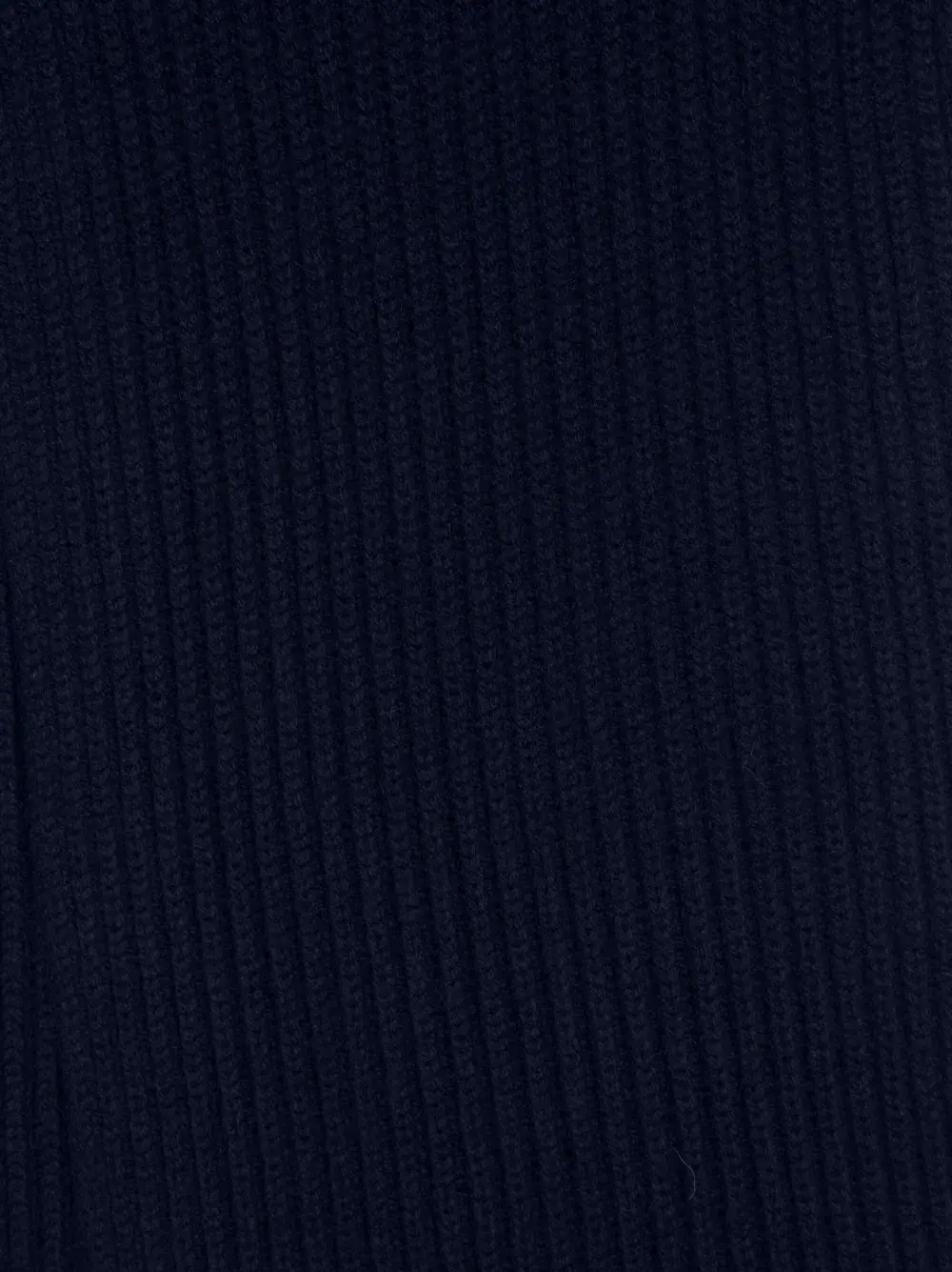 Темно-синий, шерсть, трикотаж в рубчик, нашивка с логотипом спереди и обработанные края.