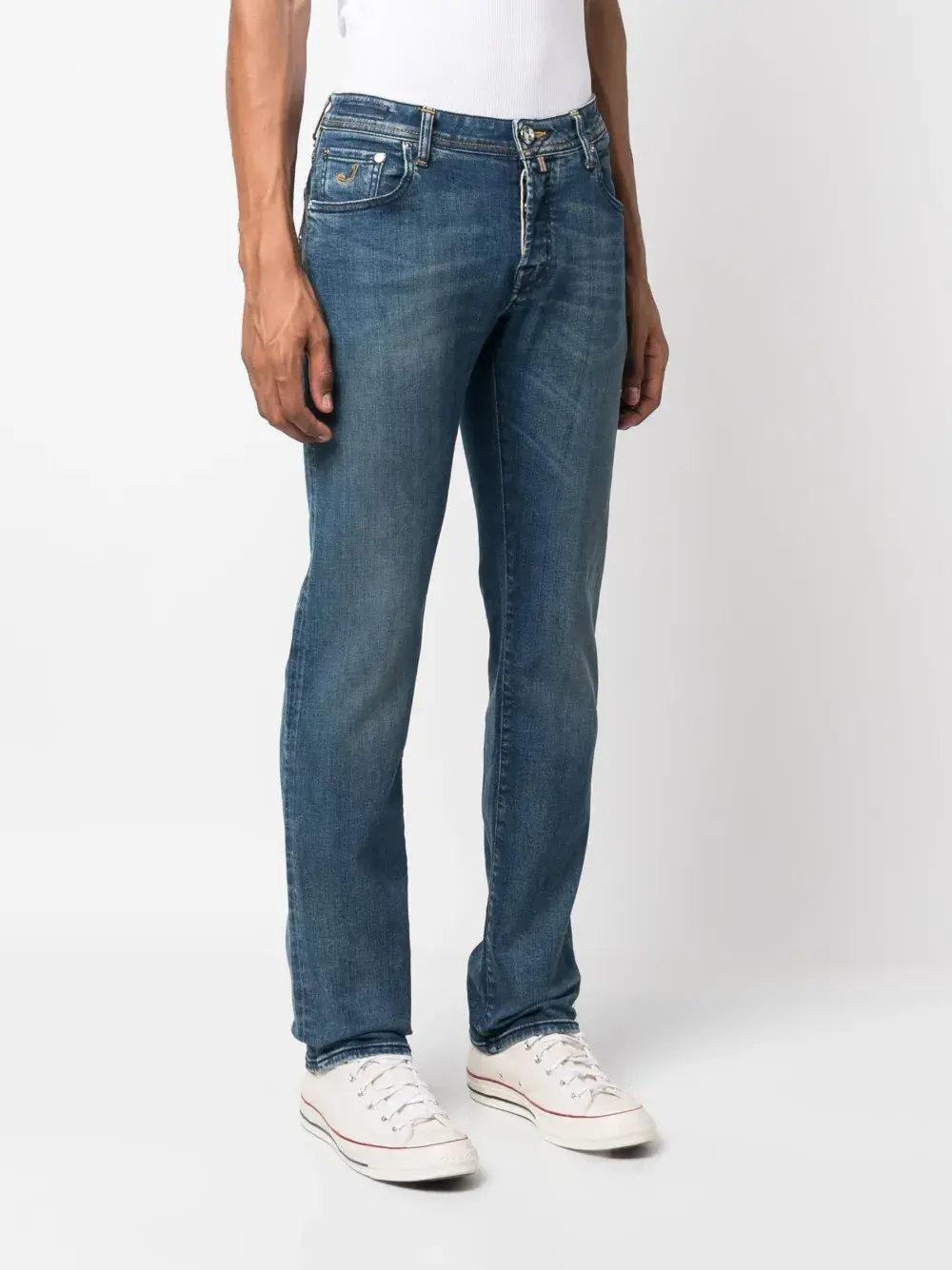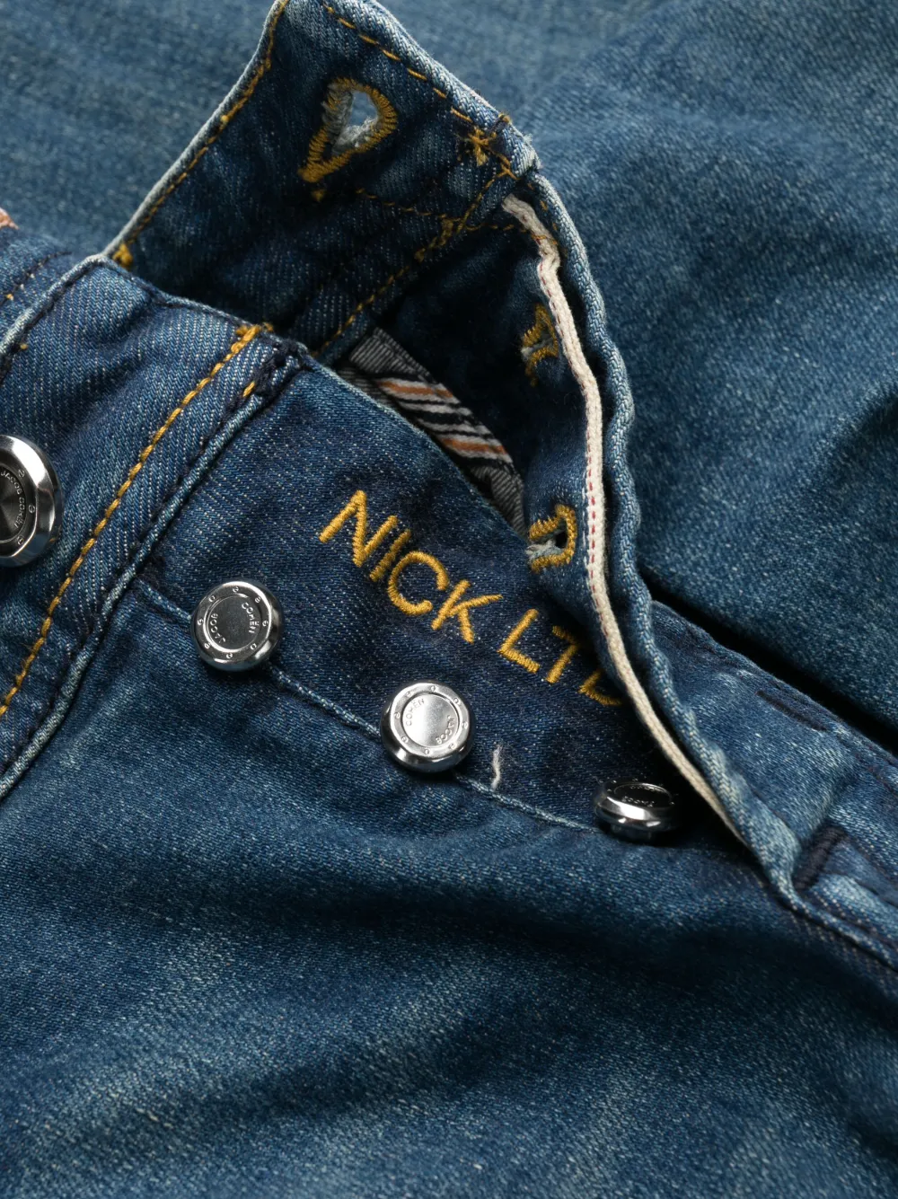 Вышитый логотип спереди, ширинка на пуговицах и пять карманов.