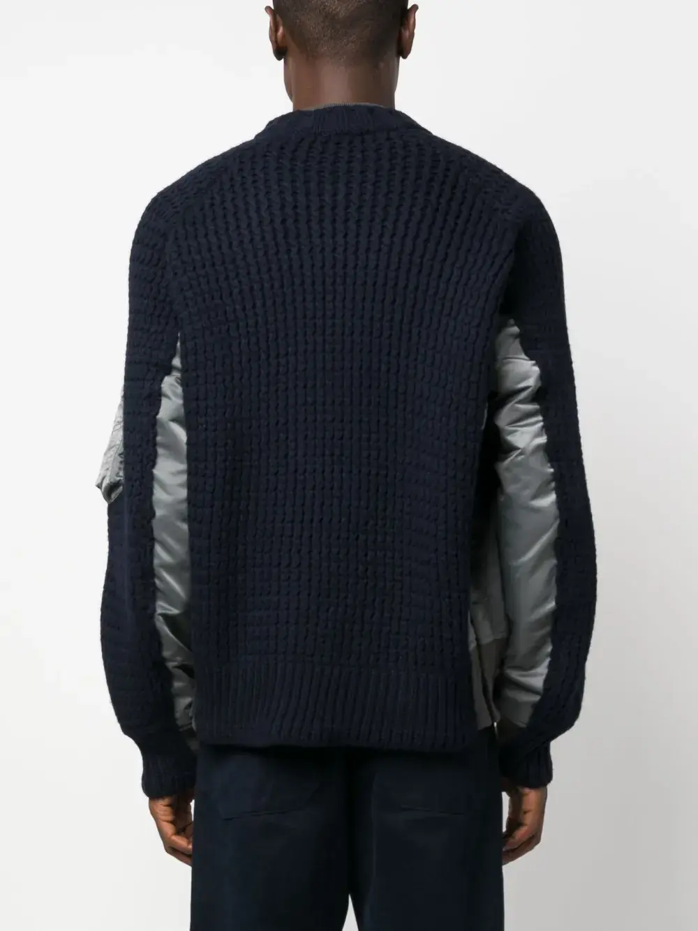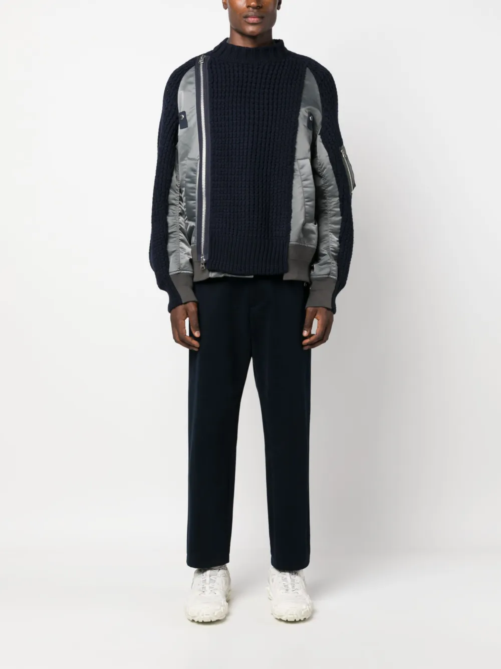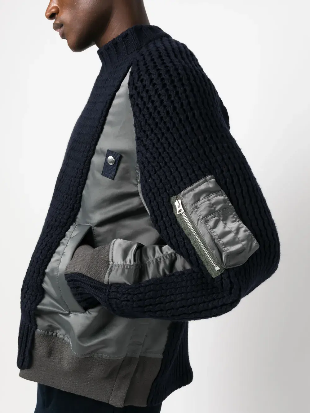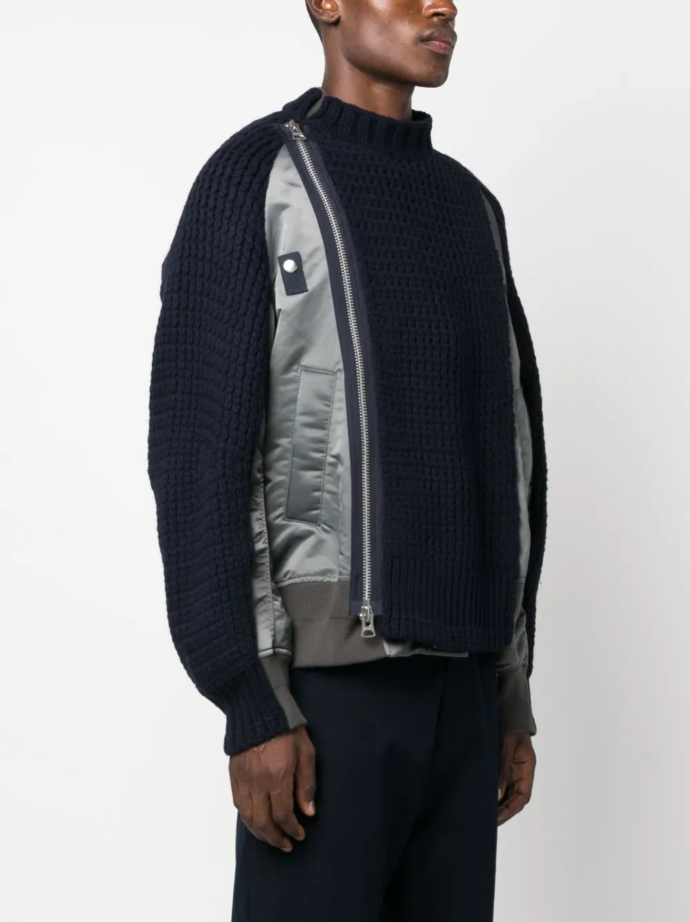 Темно-синий, смесовая шерсть, хлопок, крупная вязка, вставки, смещенная застежка на молнии спереди, два вшитых кармана по бокам, карман с молнией на рукаве, длинные рукава, эластичные манжеты и прямой подол.