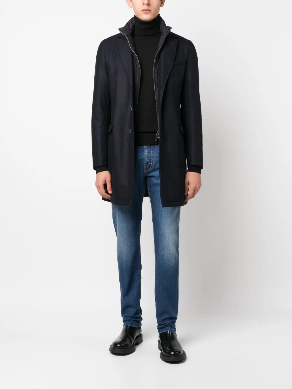 Темно-синий, смесь шерсти и кашемира, высокий воротник, зазубренные лацканы, застежка на пуговицах спереди, застежка на молнии спереди, два передних кармана с клапанами, прорезной карман на груди, длинные рукава, манжеты на пуговицах и прямой подол.