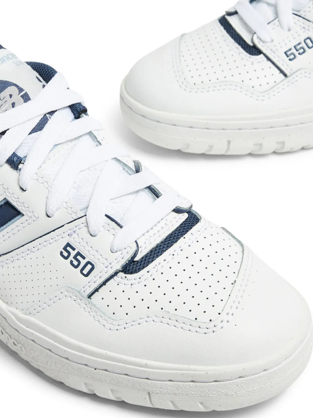 Белый, темно-синий, голубой, кожа, сетчатые вставки, вставки, перфорация, нашивка с логотипом на язычке, логотип-аппликация, закругленный носок, шнуровка спереди, контрастный задник и плоская резиновая подошва.