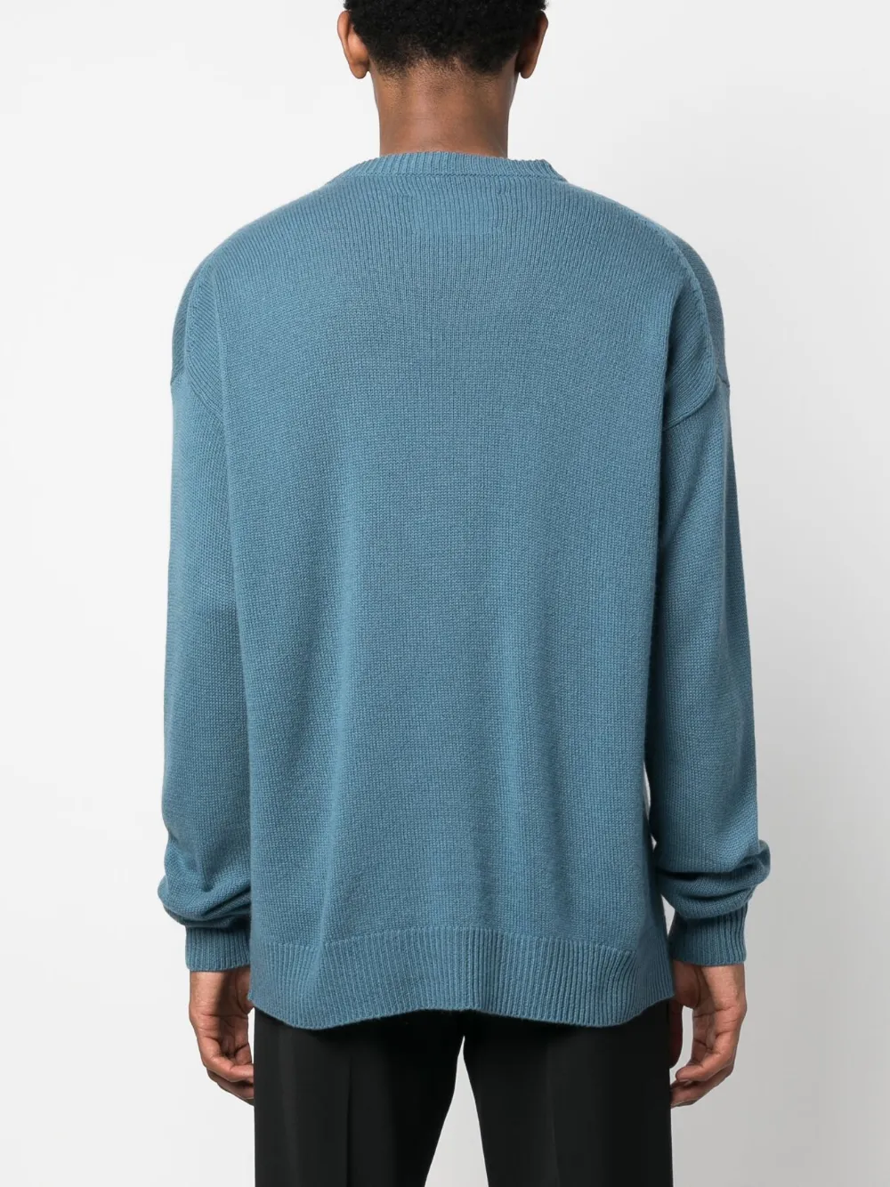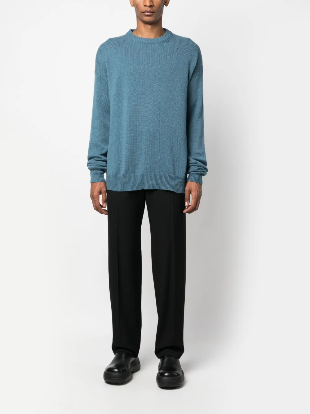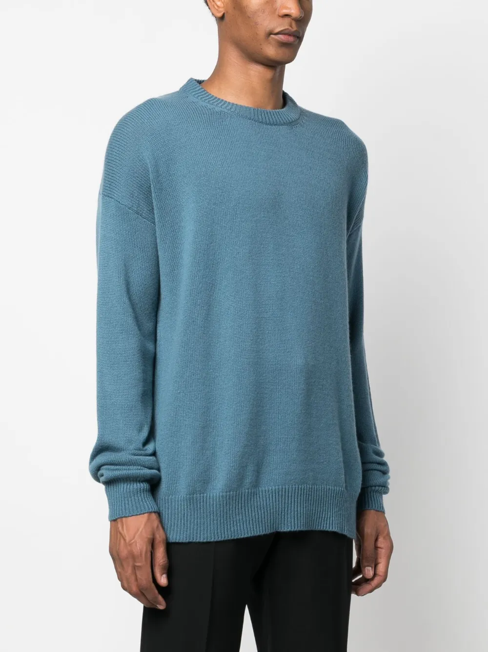Расцветка Ocean Blue, кашемир, трикотажный материал, края в рубчик, приспущенные плечи, круглый вырез, длинные рукава и прямой подол.