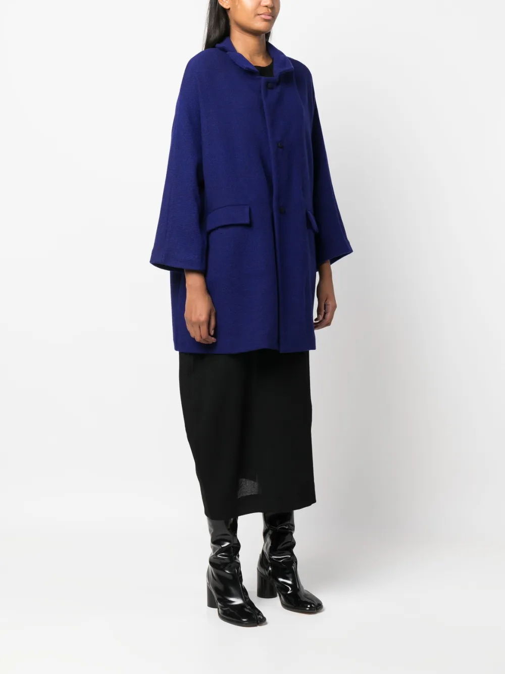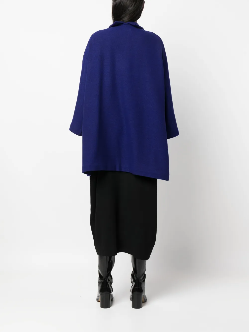 Синий, шерсть, трикотажный материал, отложный воротник, застежка на пуговицах спереди, рукава «колокол», два кармана с клапанами по бокам и прямой подол.