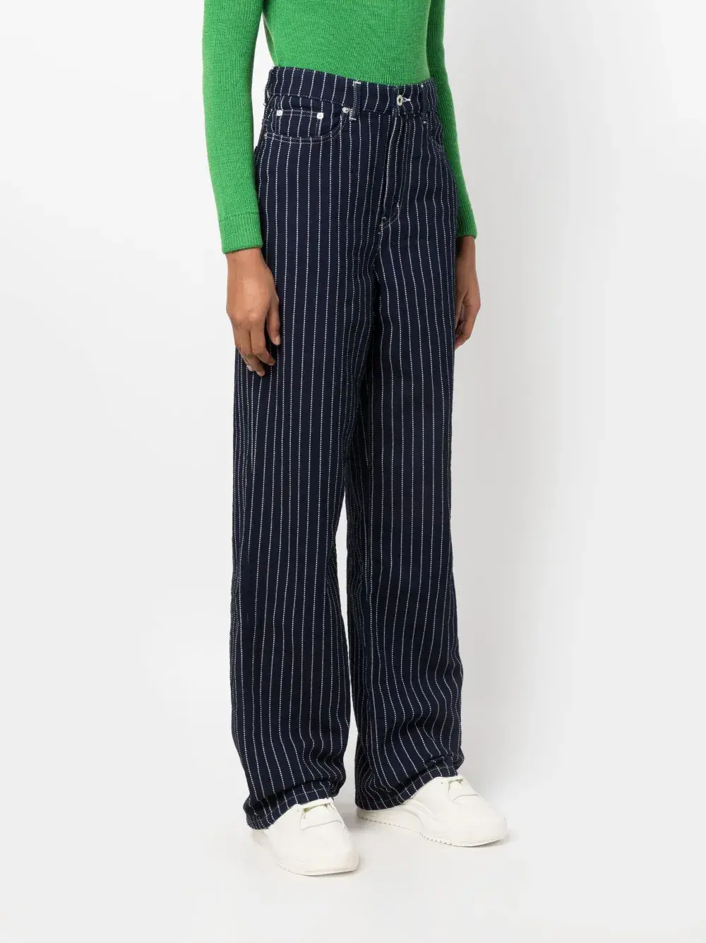 Темно-синий, хлопок, узор в полоску, завышенная талия, застежка на молнии и пуговице спереди, прямой крой и пять карманов.