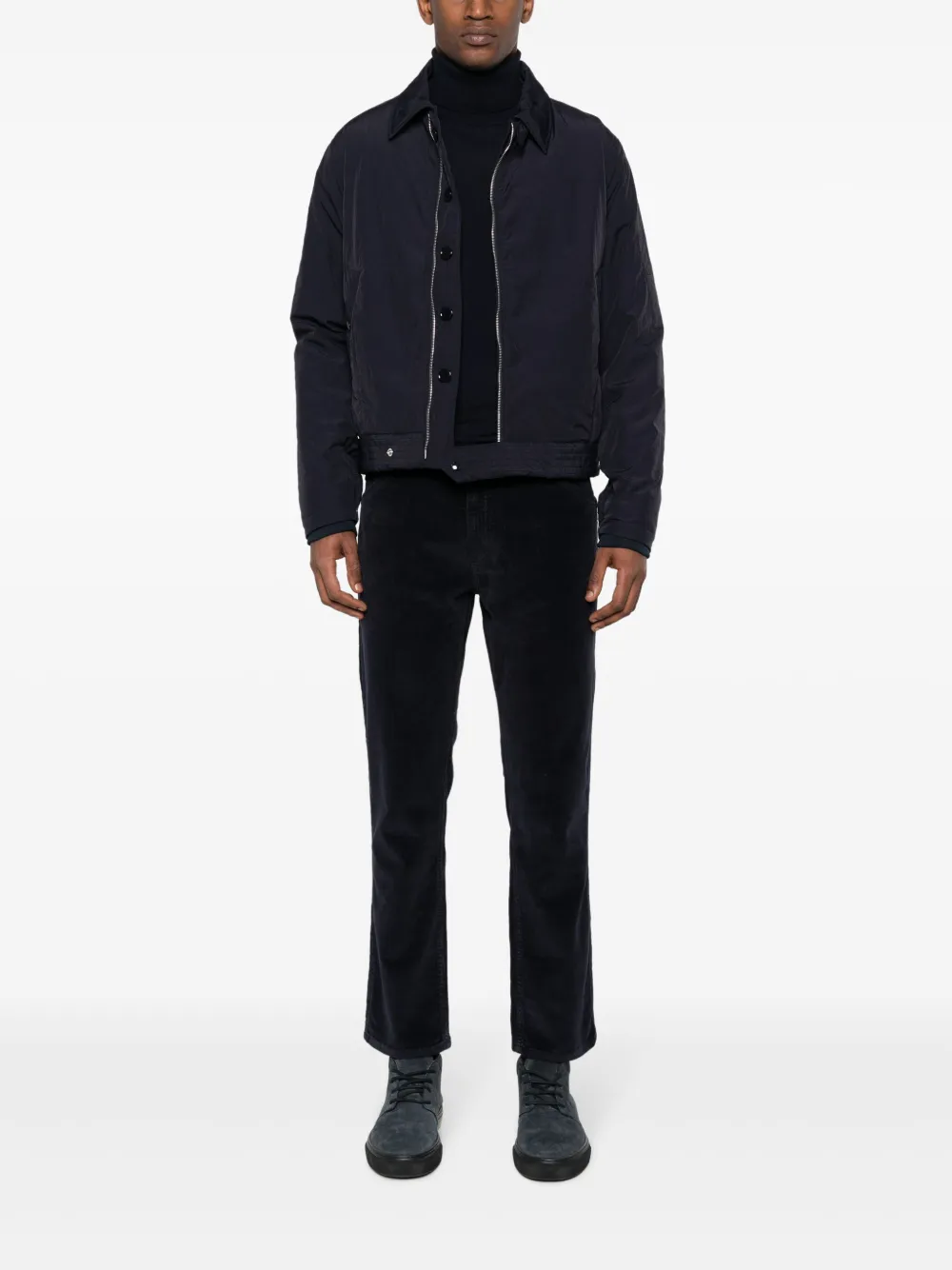 Темно-синий, шерсть, меланжевая пряжа, высокий воротник, длинные рукава и прямой подол.
