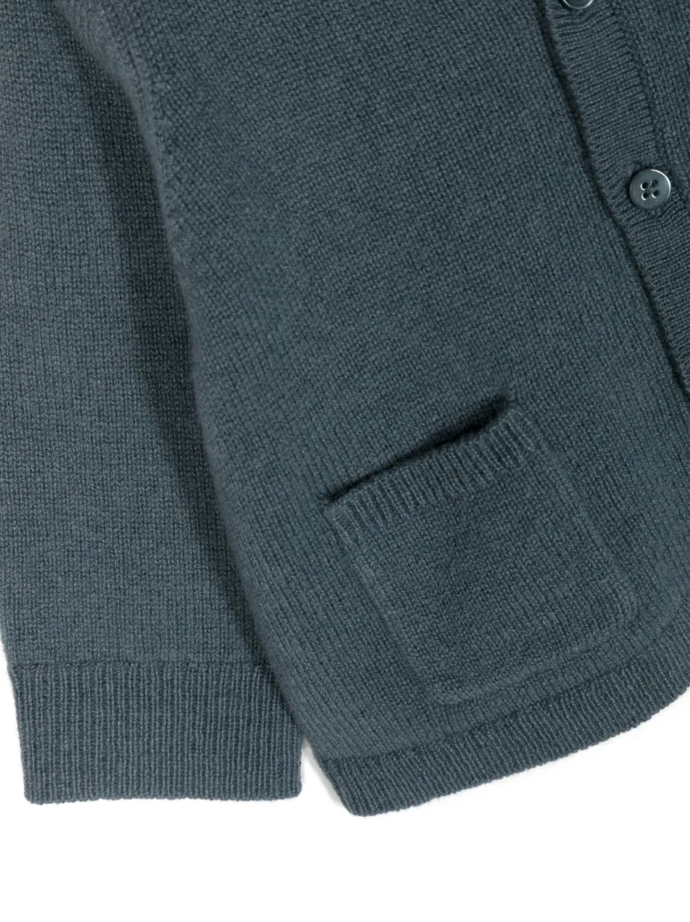 Темно-синий, кашемир, V-образный вырез, застежка на пуговицах спереди, длинные рукава и два накладных кармана спереди.