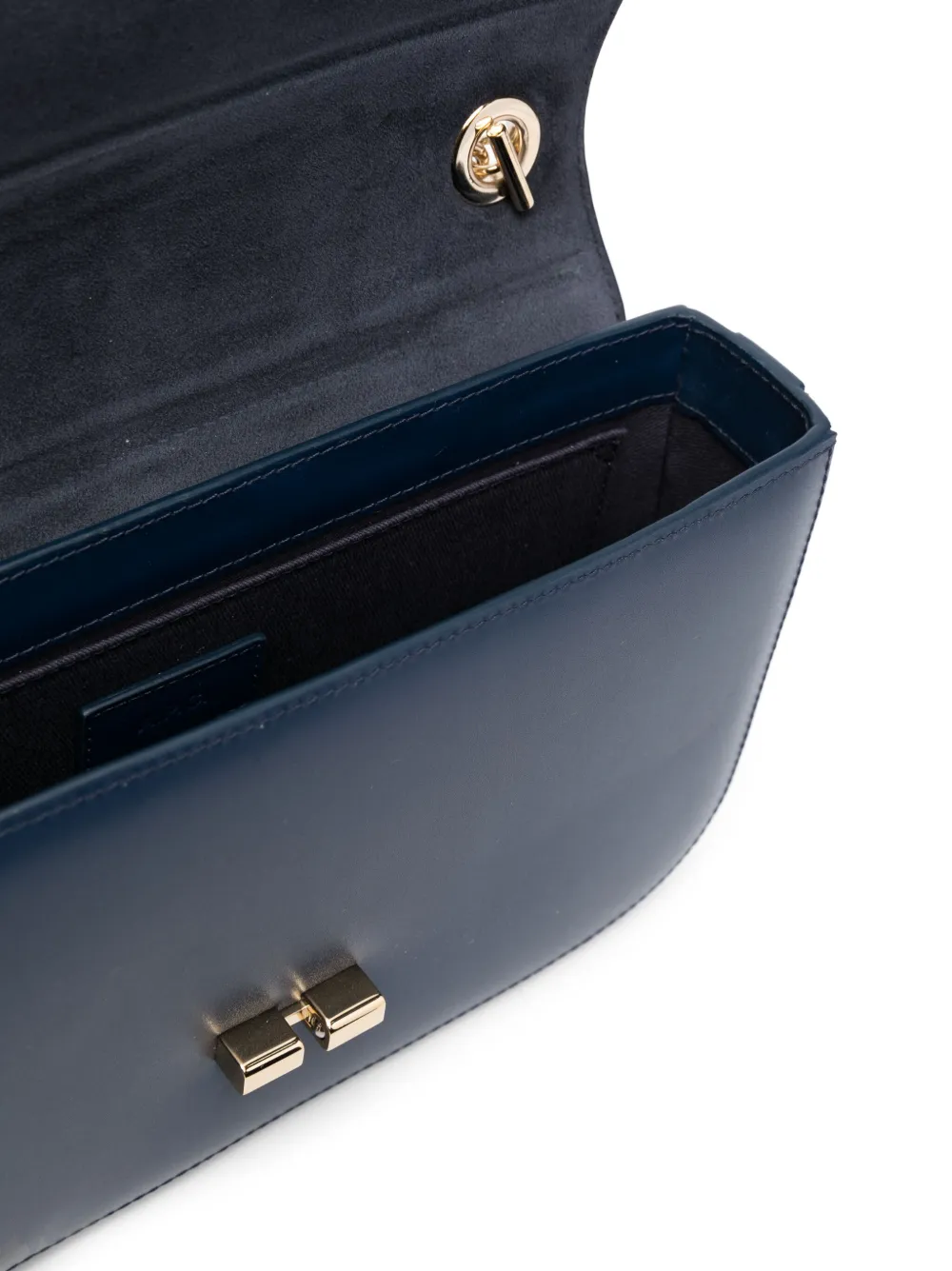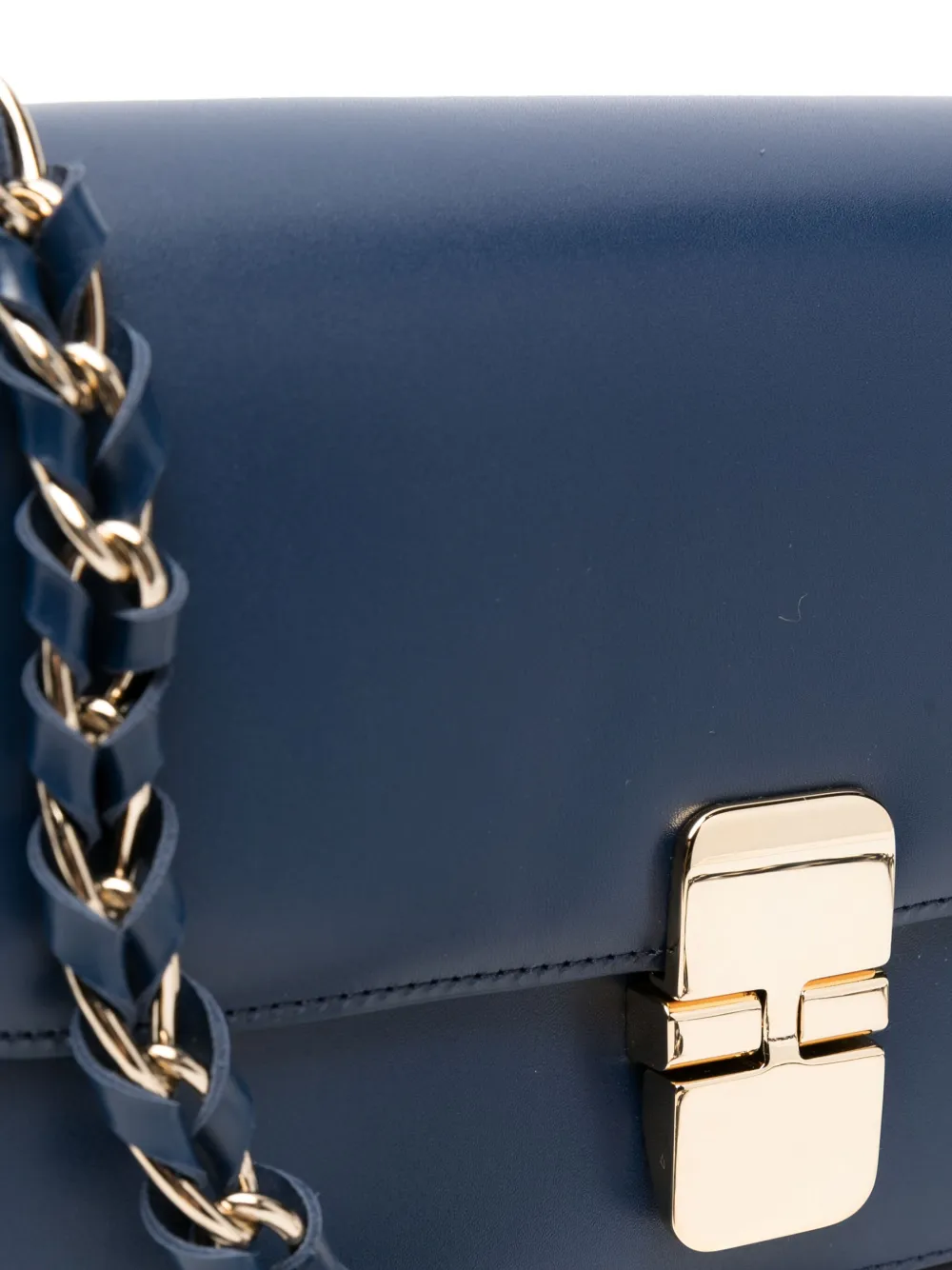 Темно-синий, телячья кожа, золотистая фурнитура, ремень на плечо с цепочной деталью, откидной клапан, внутренний прорезной карман и нашивка с логотипом внутри.