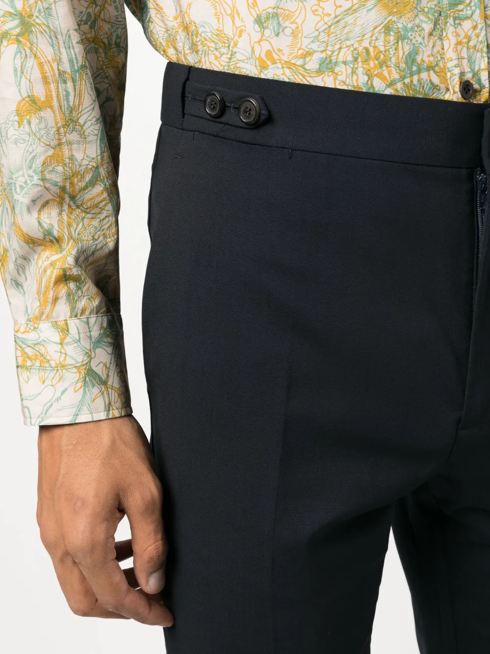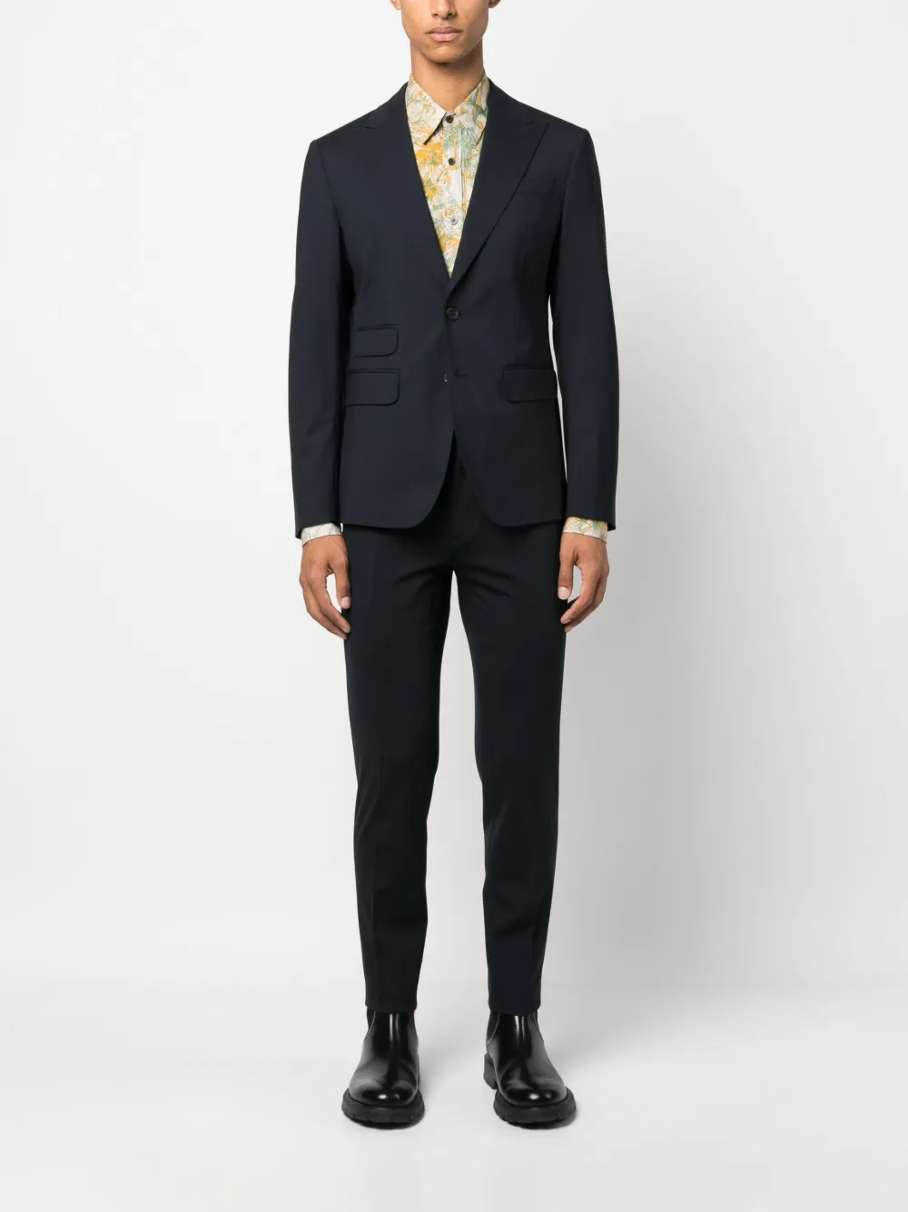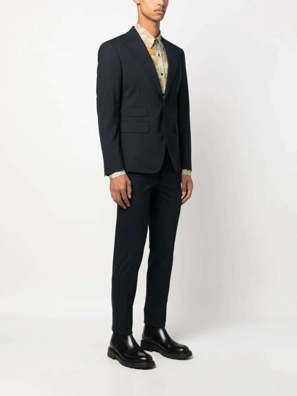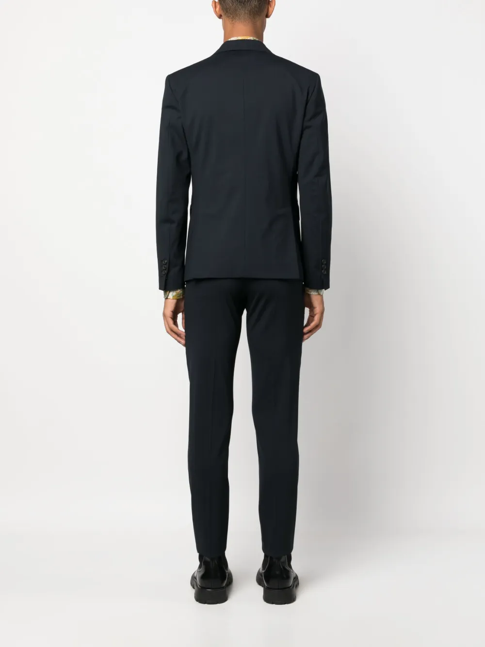 Темно-синий, необработанная шерсть, хлопок, заостренные лацканы, застежка на пуговицах спереди, длинные рукава, манжеты на пуговицах, прорезной карман на груди, передние карманы с клапаном, две боковые шлицы сзади, закругленный подол, прямой крой, средняя посадка, потайная застежка спереди, регулируемые боковые резинки, два прорезных кармана по бокам, два кармана на пуговице сзади и стрелки.