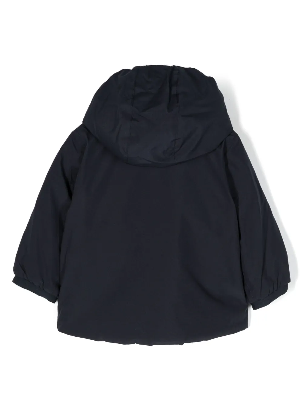 Темно-синий, утиные перья, дутый материал, нашивка с логотипом на груди, высокий воротник, классический капюшон, застежка на молнии спереди, длинные рукава, эластичные манжеты и прямой подол.