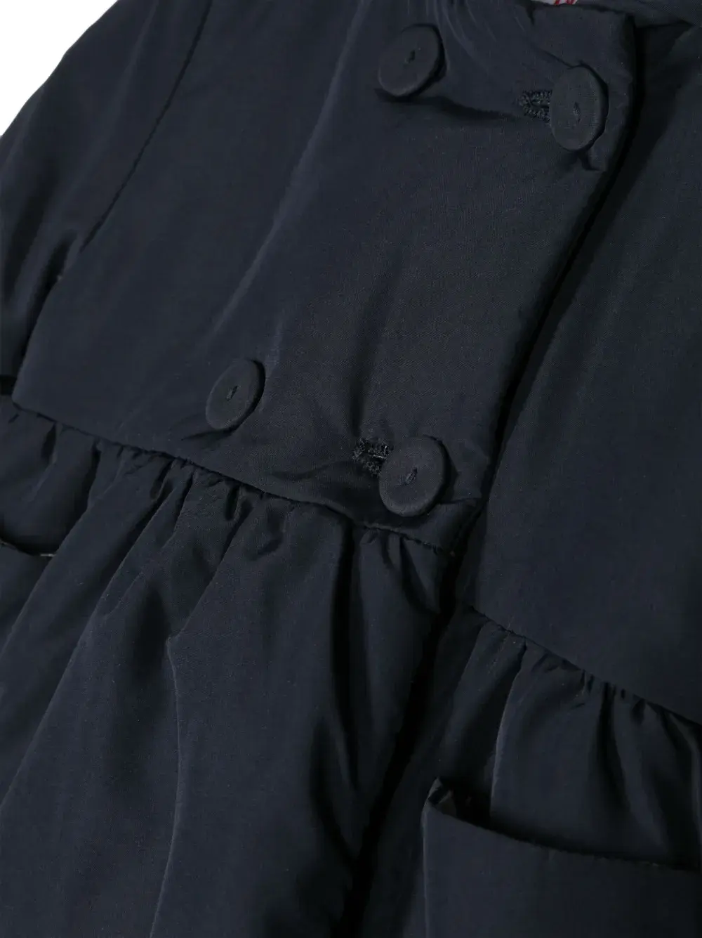 Дутый материал, подкладка из джерси, нашивка с логотипом на рукаве, двубортная застежка на кнопки и два накладных кармана спереди.