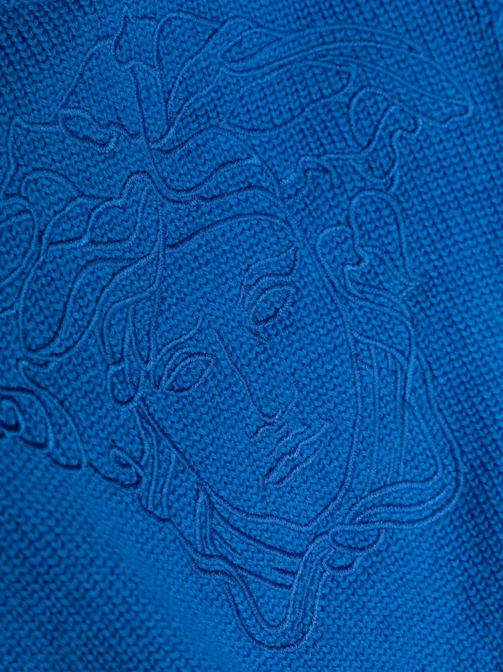 Синий, необработанная шерсть, трикотажный материал, узор Medusa Head, вышитый узор, круглый вырез, пуговичные застежки на плечах, длинные рукава и прямой подол.