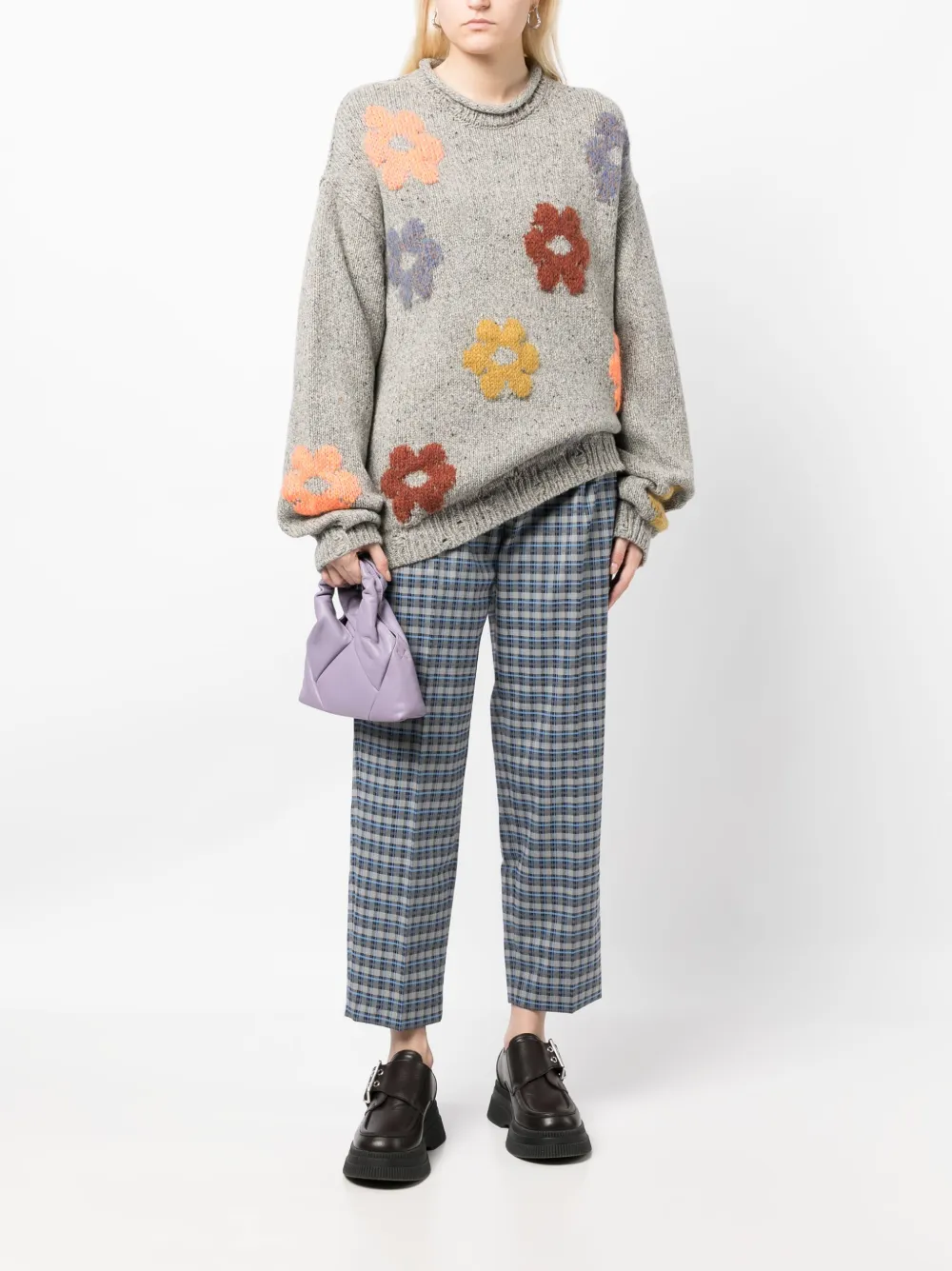 Синий, разноцветный, смесовая шерсть, завышенная талия, строчка в тон, укороченная длина, петли для ремня, потайная застежка спереди, два кармана с листочкой сзади, два прорезных кармана по бокам и прямой подол.