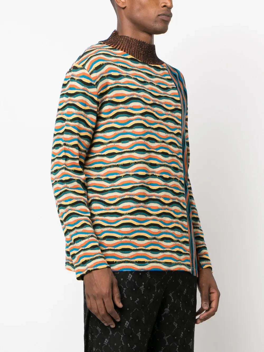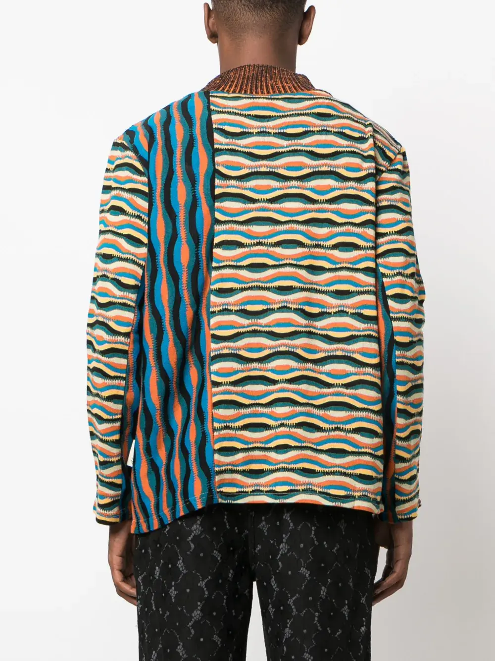Разноцветный, смешанный принт, зигзагообразная вышивка, воротник-стойка в рубчик, длинные рукава и асимметричный подол.