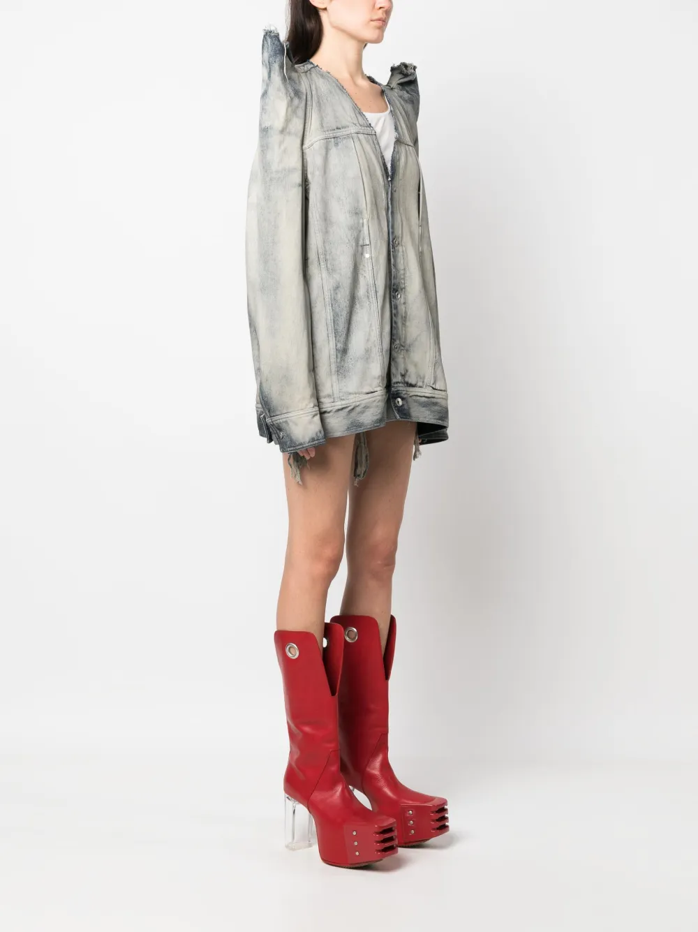 Индиго, хлопок, эффект потертости, объемная аппликация, проклеенные швы, необработанные края, глубокий V-образный вырез, застежка на пуговицах спереди, удлиненные рукава, два прорезных кармана по бокам и прямой подол.