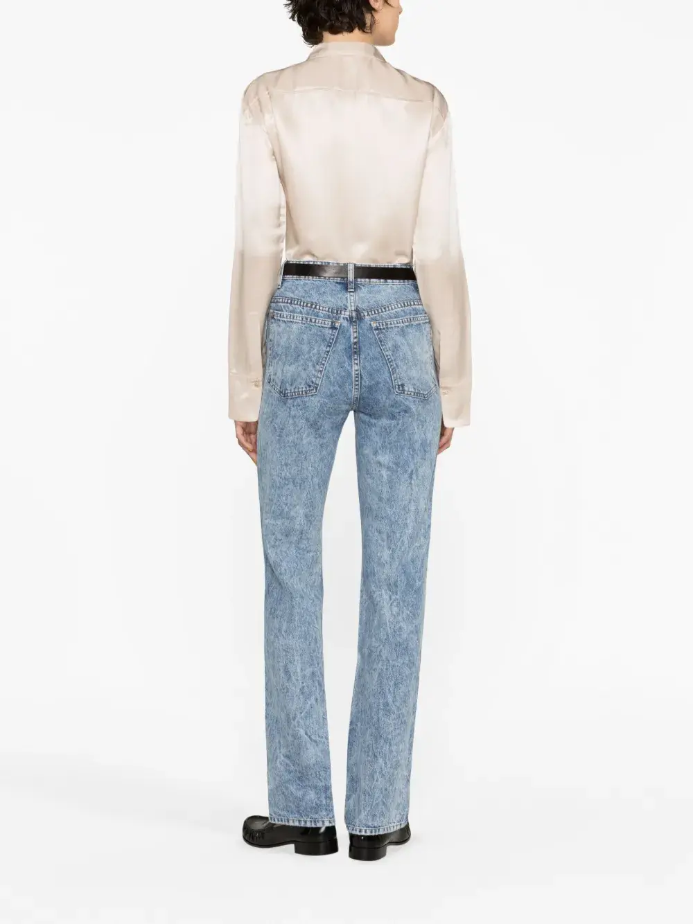 Голубой, хлопок, переработанный хлопок, деним, эффект кислотной стирки, прямой крой, завышенная талия, петли для ремня, застежка на молнии и пуговице спереди и пять карманов.