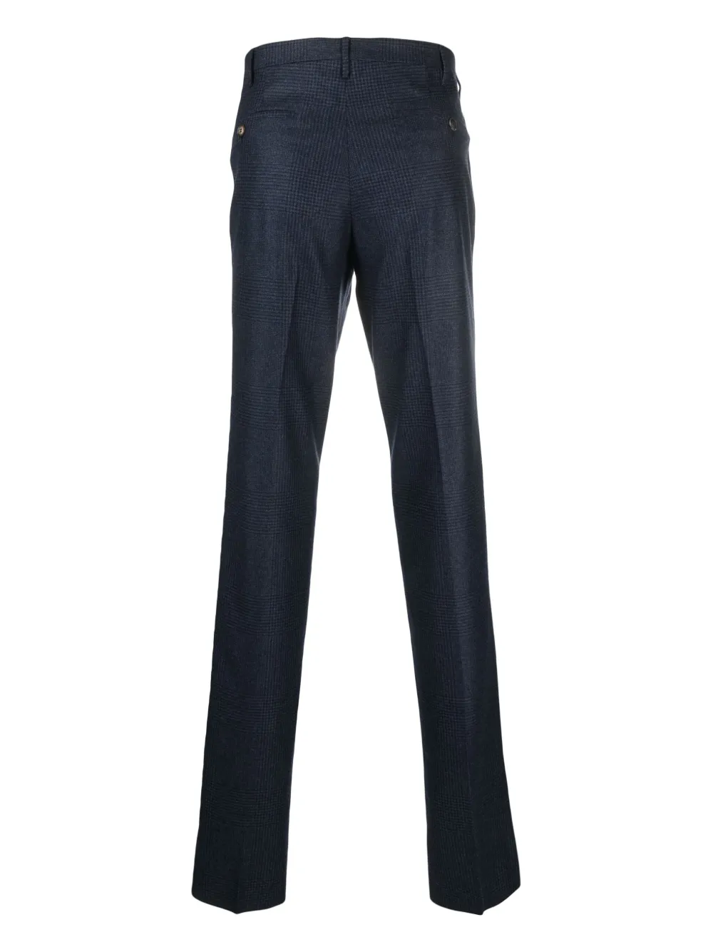 Темно-синий, необработанная шерсть, хлопок, клетчатый узор, петли для ремня, стрелки, застежка на молнии и пуговице спереди, прямой крой, два прорезных кармана по бокам и два кармана с листочкой сзади.
