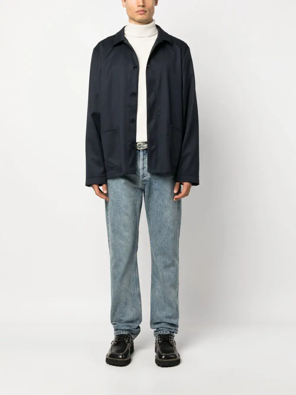Темно-синий, шерсть, классический воротник, длинные рукава, застежка на пуговицах спереди, два накладных кармана спереди и прямой подол.