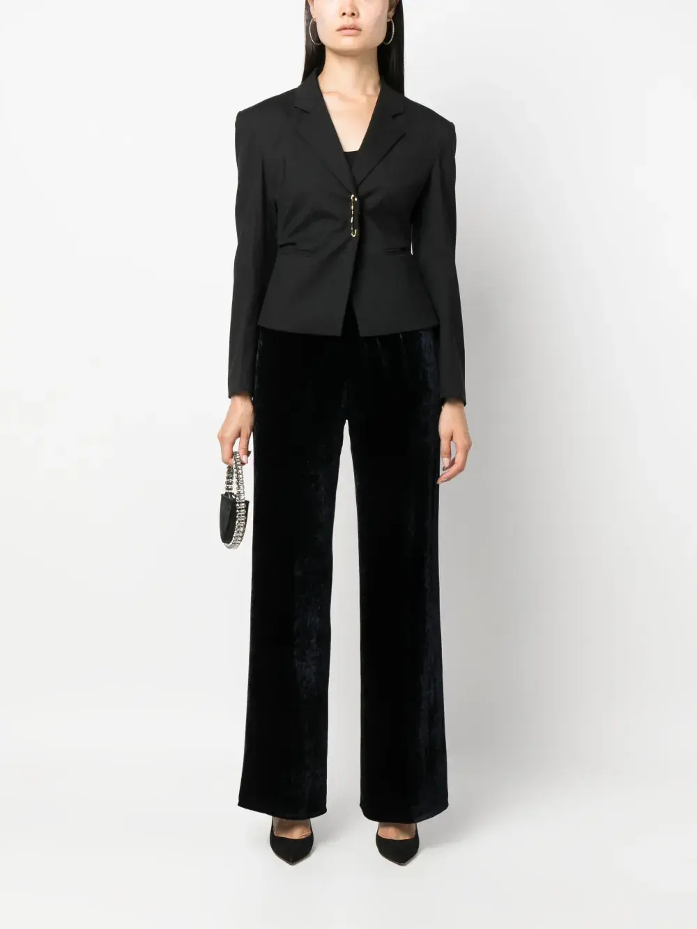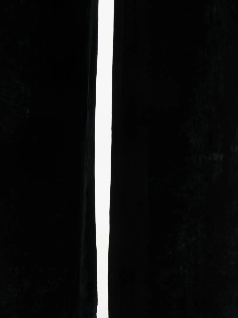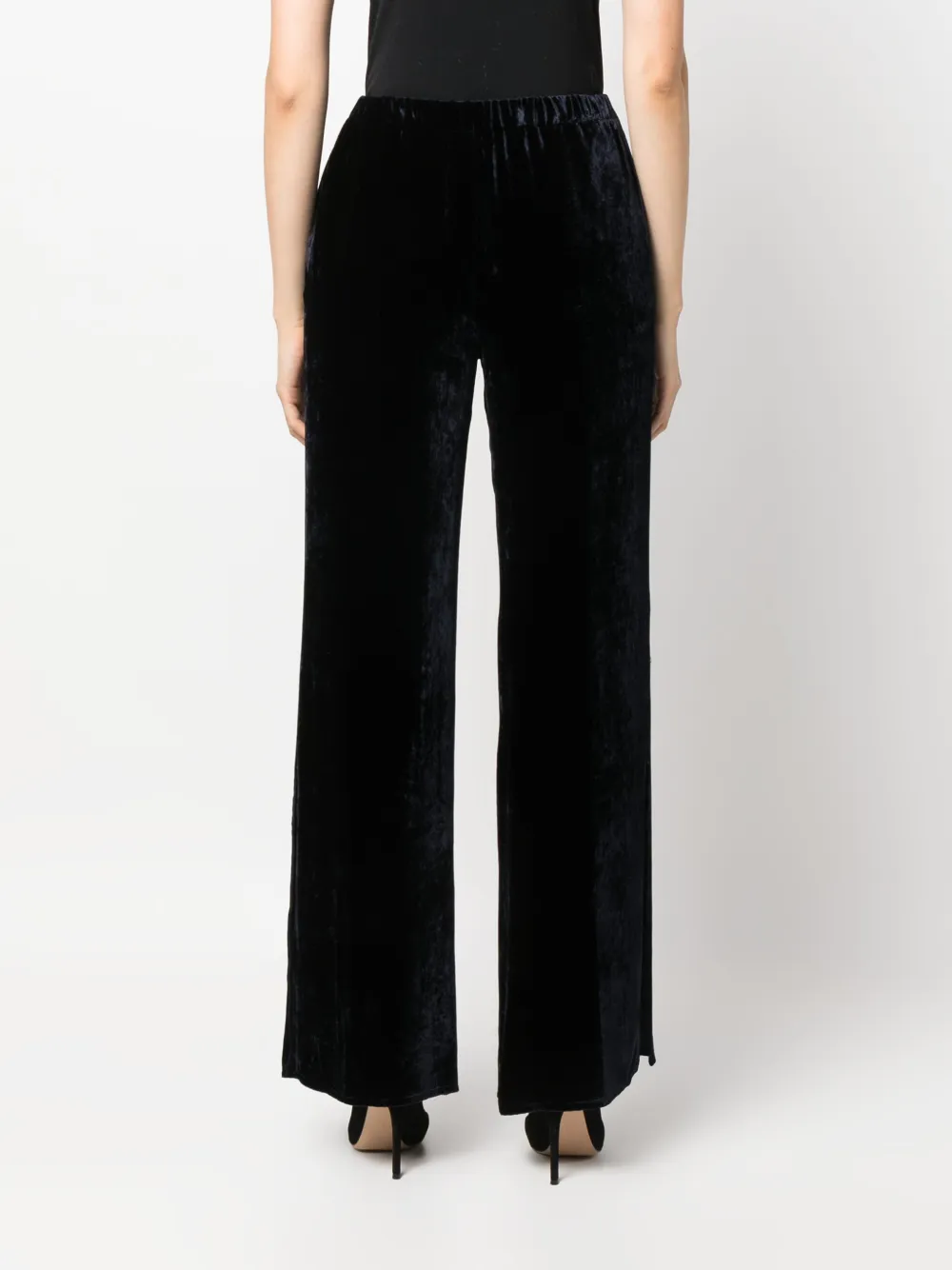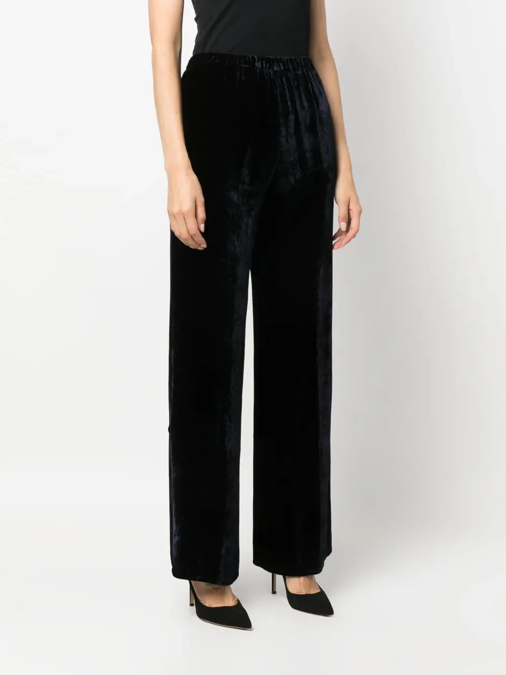 Бархатный эффект, прямой крой, завышенная талия и эластичный пояс.