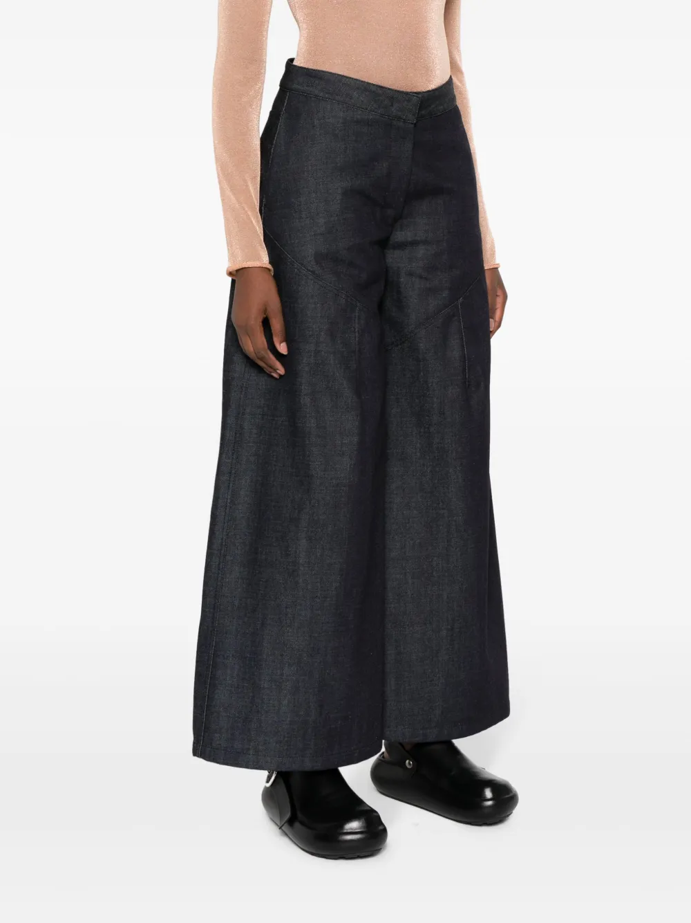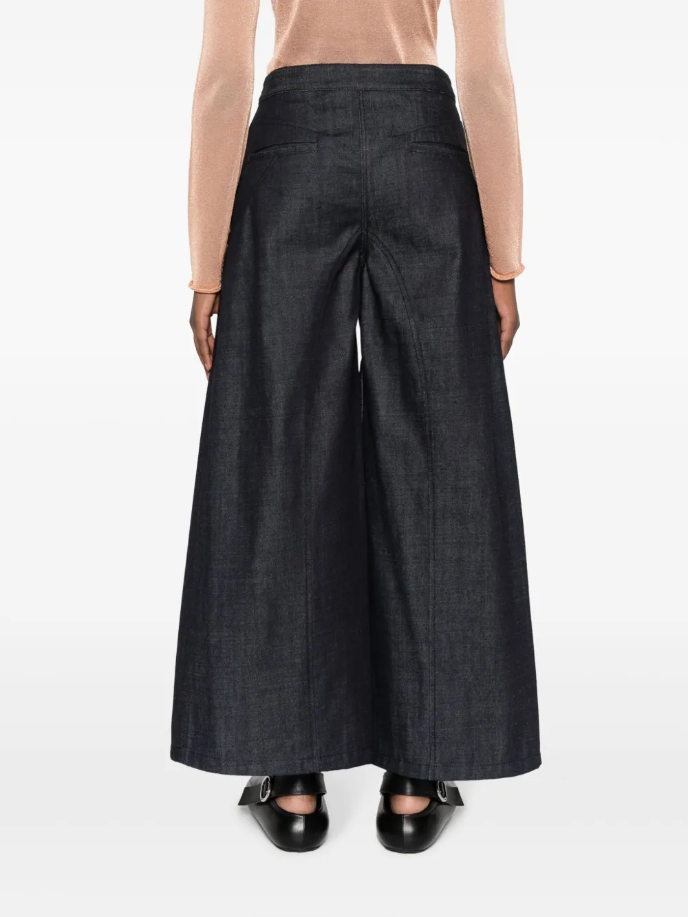 Индиго, хлопок, средняя посадка, широкий крой, укороченная длина, потайная застежка спереди и два кармана с листочкой сзади.