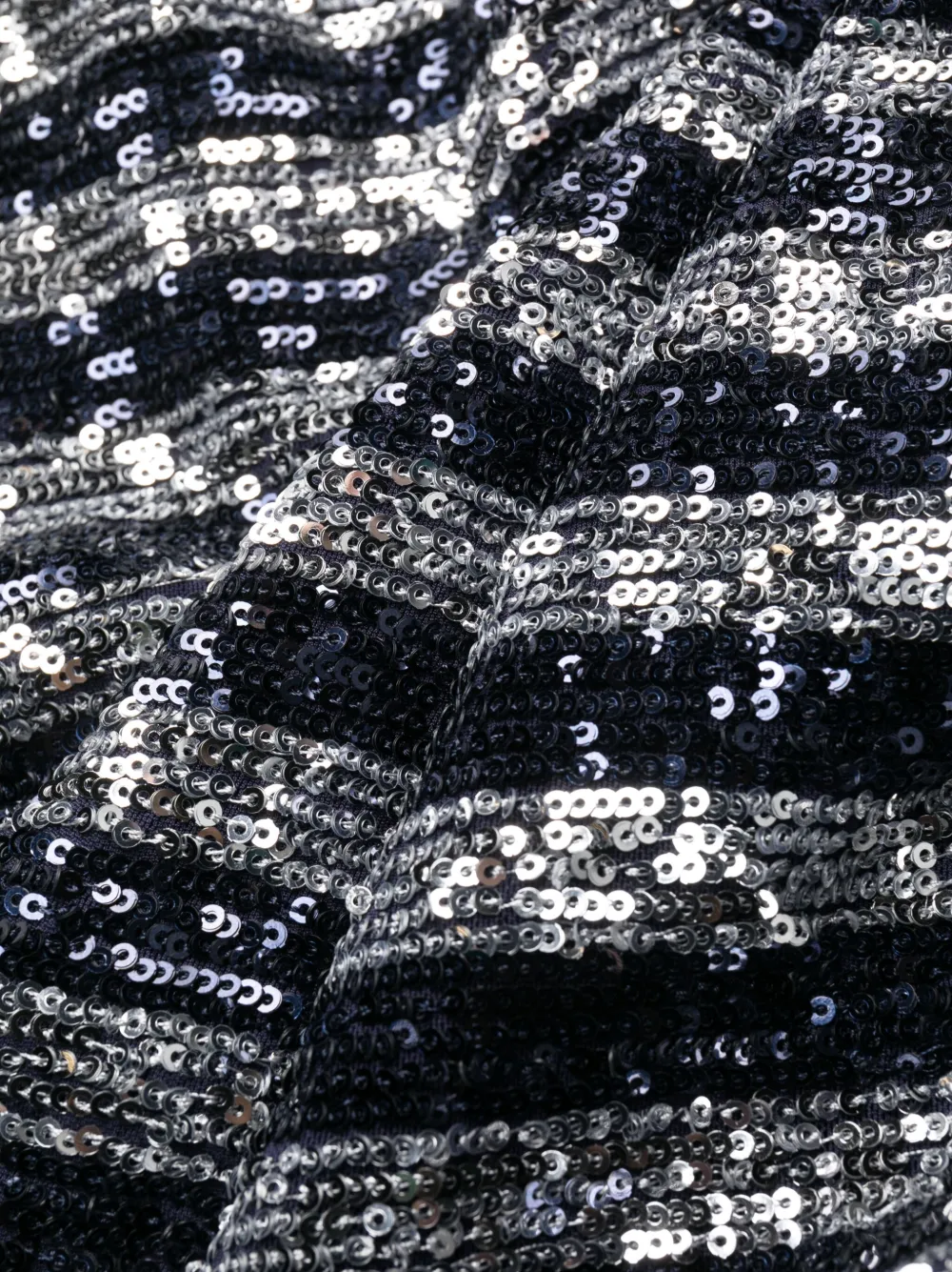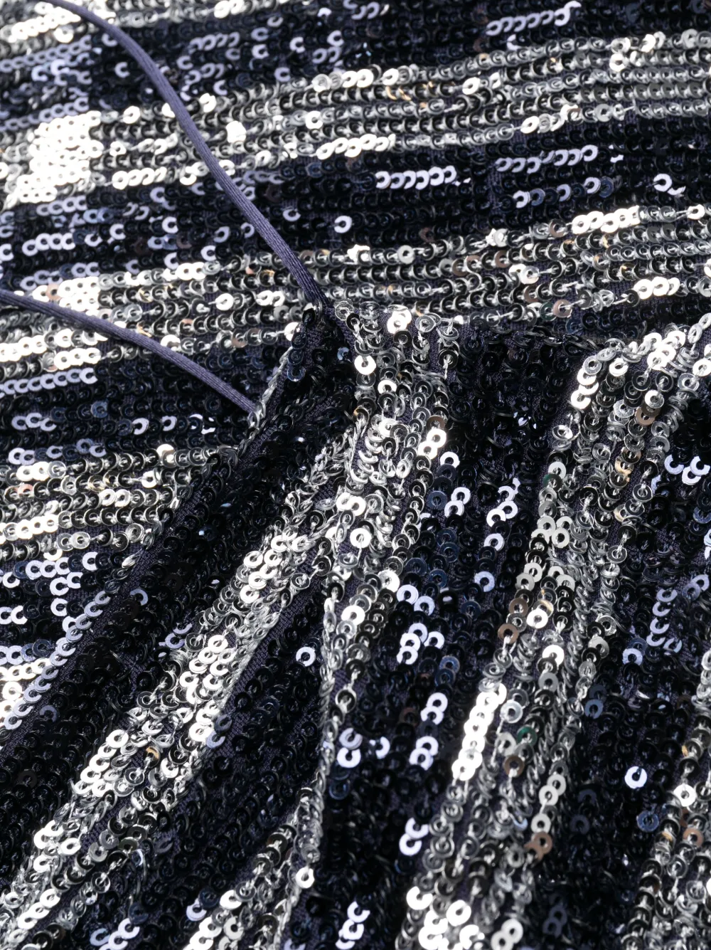 Темно-синий, серебристый, пайетки, узор в горизонтальную полоску, тонкие бретели, воротник-хомут, приталенный силуэт, прямой подол, длина до бедер и потайная застежка на молнии сбоку.