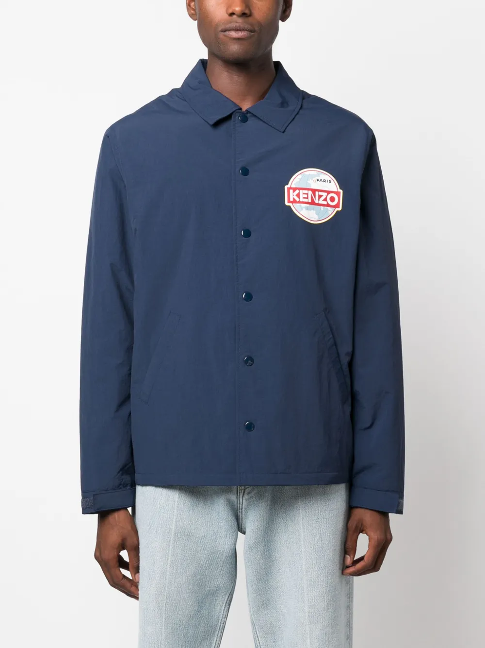 Темно-синий, принт с логотипом на груди, принт с логотипом сзади, классический воротник, застежка на кнопках спереди, длинные рукава, манжеты на липучках, два кармана по бокам и прямой подол.