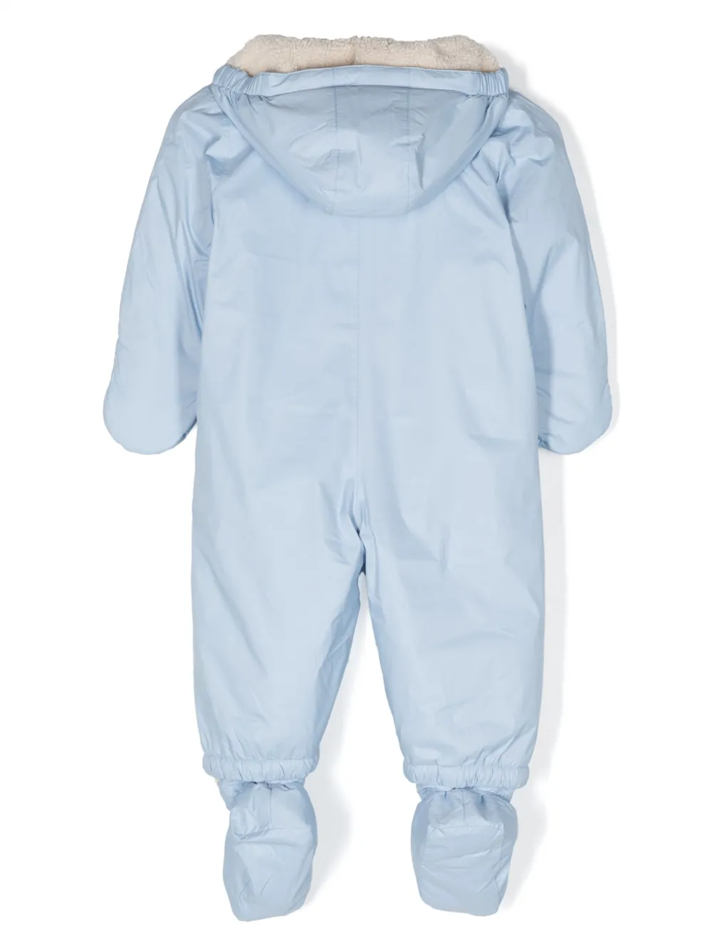 Пудрово-голубой, логотип спереди, полоски, застежка на молнии спереди, классический капюшон, длинные рукава, рукава-перчатки и пинетки.
