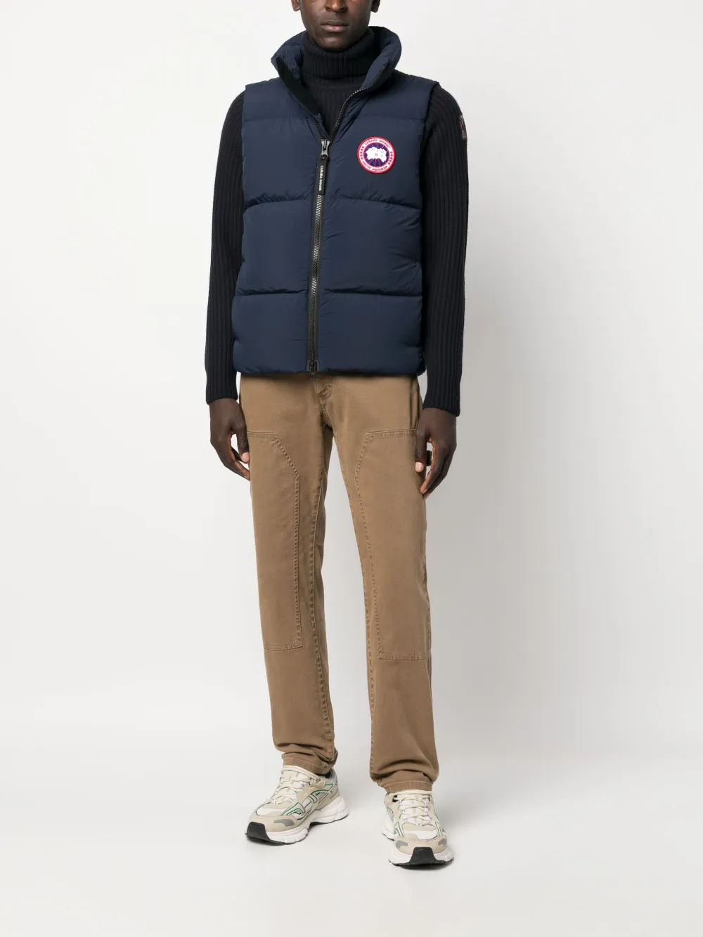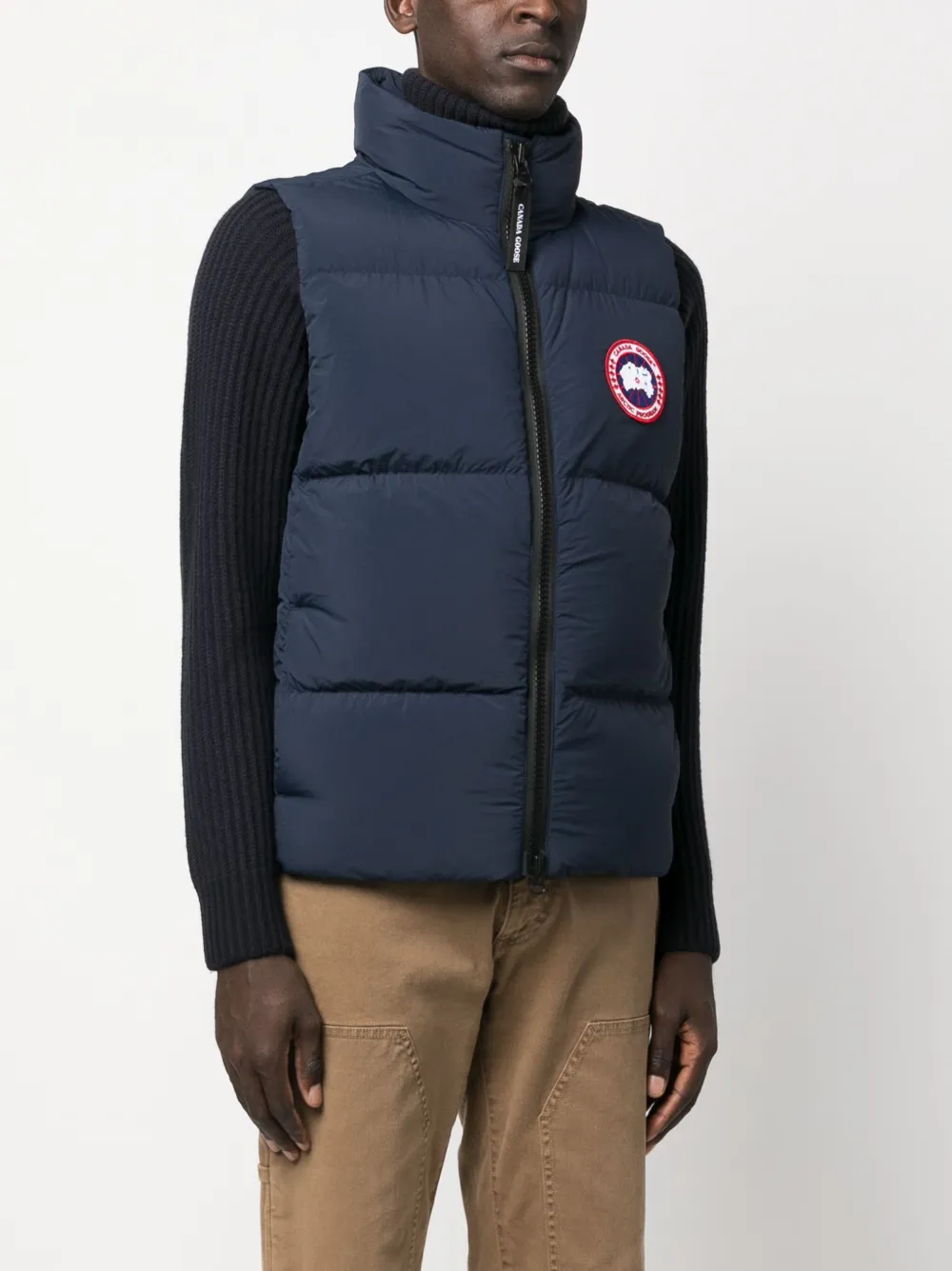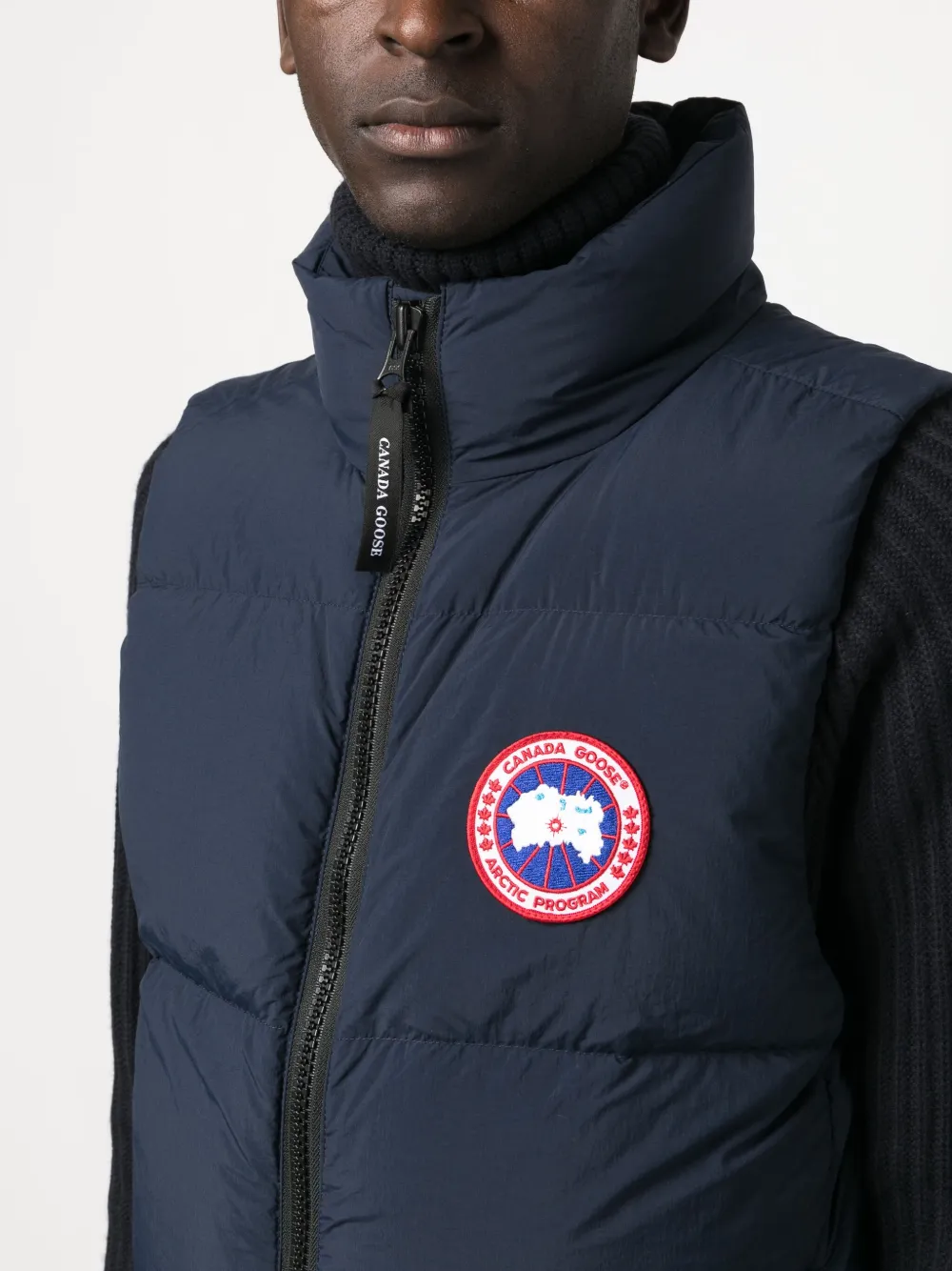 Темно-синий, наполнитель из пуха и перьев, дутый материал, нашивка с логотипом спереди, воротник-труба, застежка на молнии спереди, без рукавов и прямой подол.