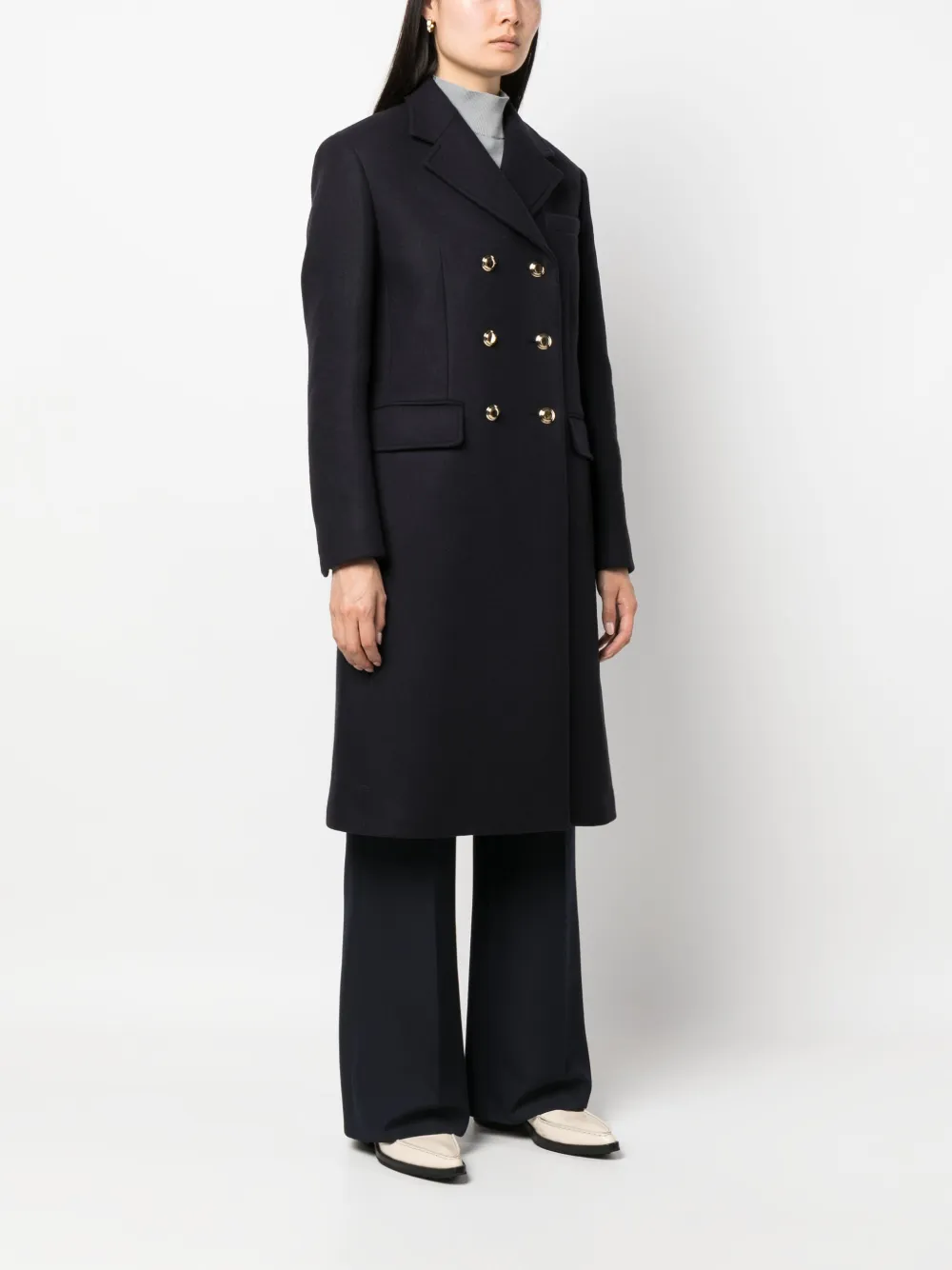 Темно-синий, необработанная шерсть, зазубренные лацканы, двубортная застежка на кнопки, два кармана с клапанами по бокам, длинные рукава, прямой подол и шлица по центру сзади.