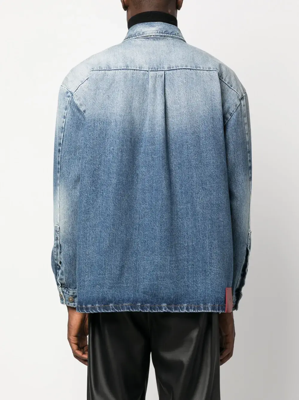 Синий, хлопок, деним, градиентный эффект, нашивка с логотипом сзади, прямой воротник, застежка на пуговицах спереди, длинные рукава, манжеты на пуговицах и прямой подол.