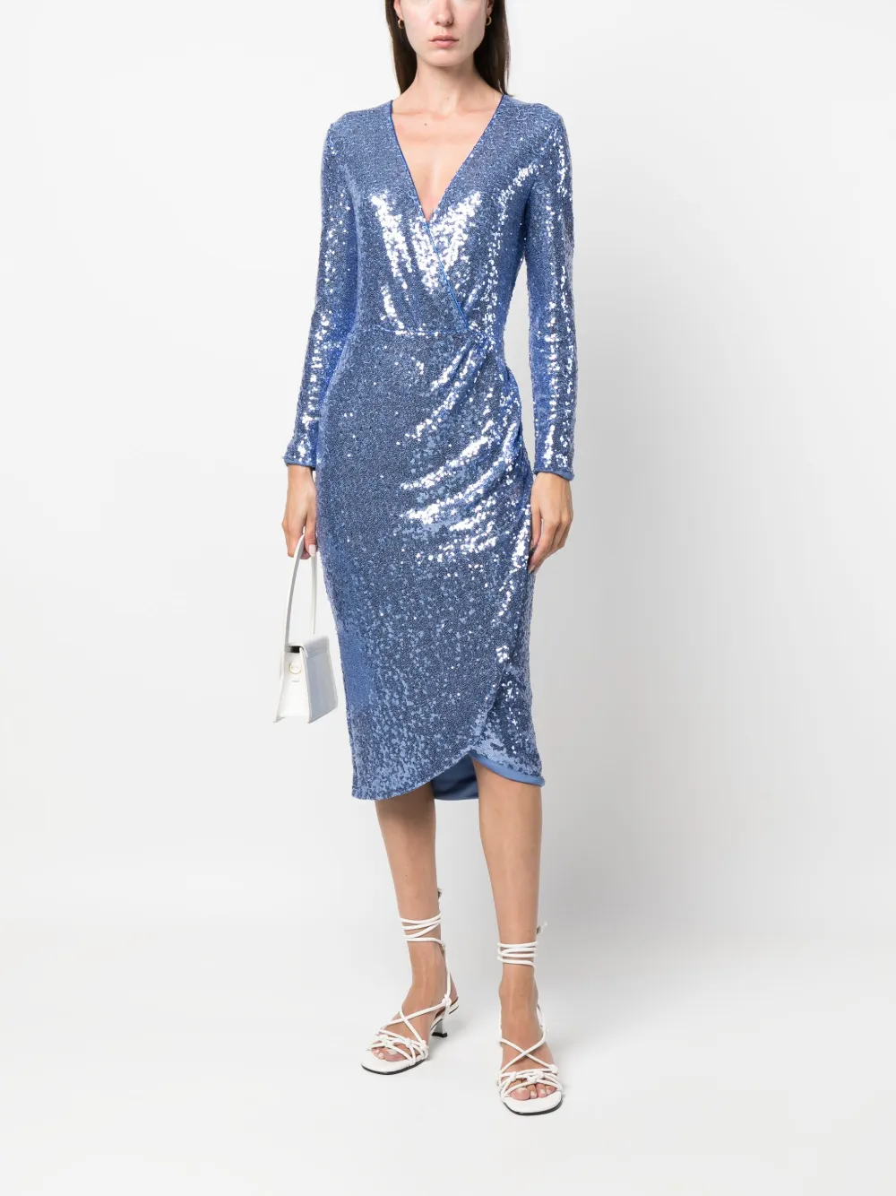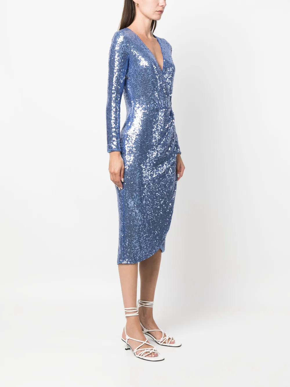 Ирисовый синий, украшение из пайеток, модель на запах, V-образный вырез, длинные рукава, приталенный силуэт, длина ниже колена и закругленный подол.