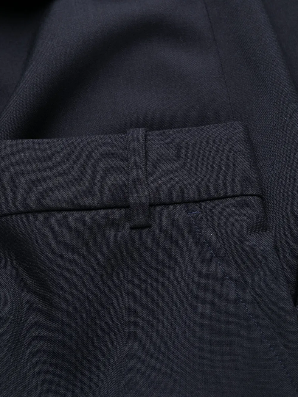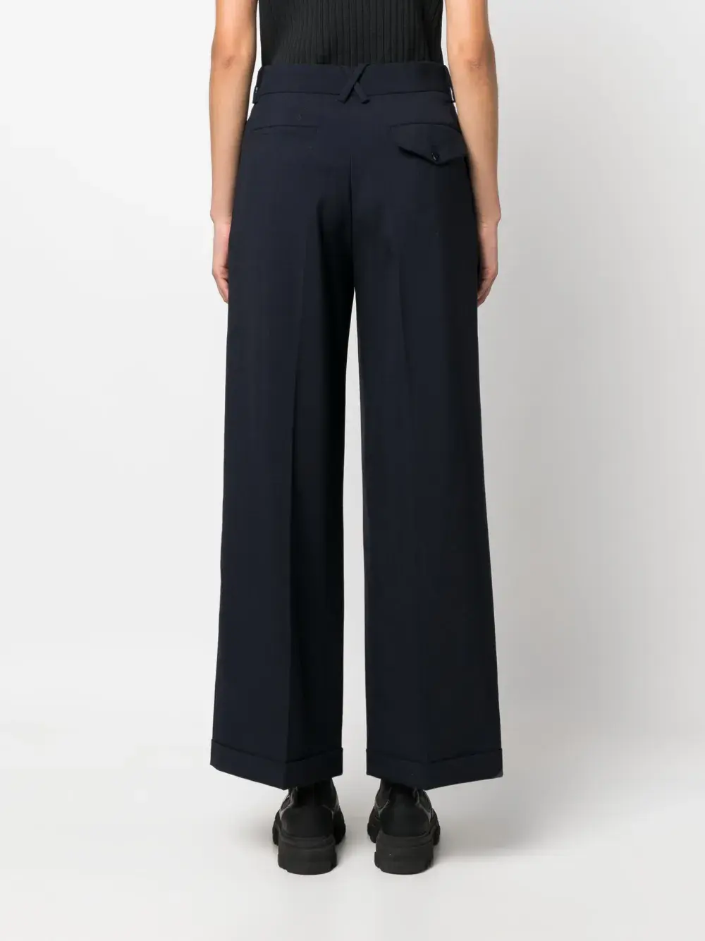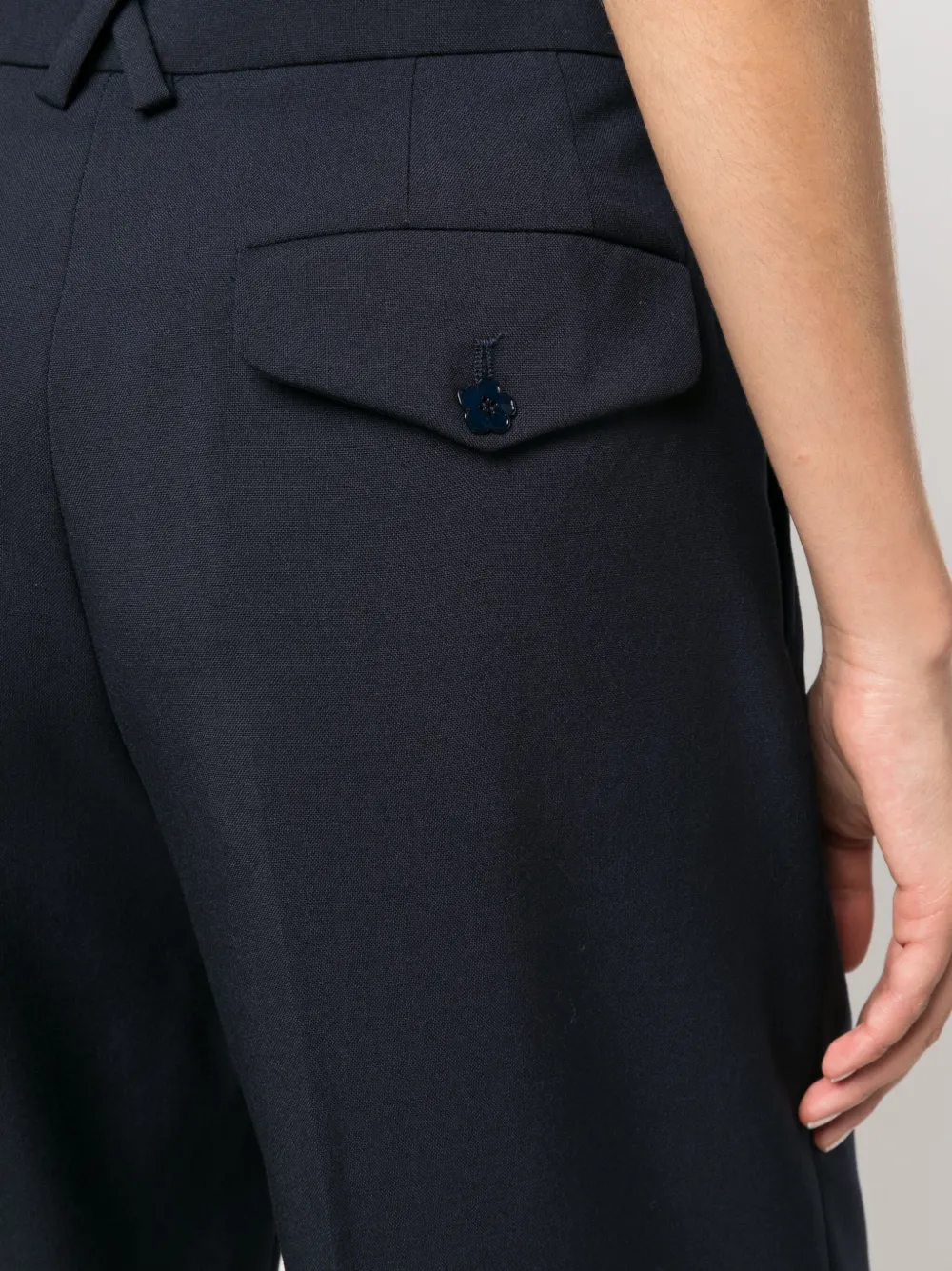 Стрелки, подвороты, потайная застежка спереди, вшитый карман сбоку, карман с клапаном сзади и задние карманы с листочкой.